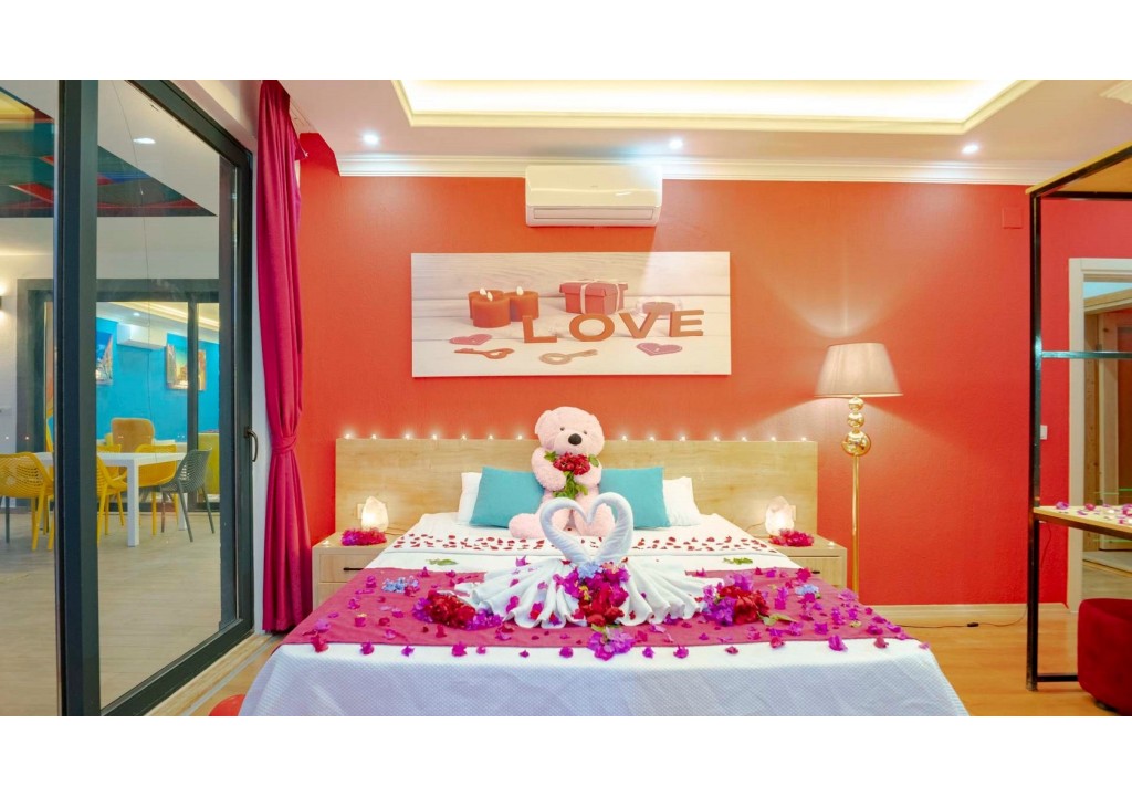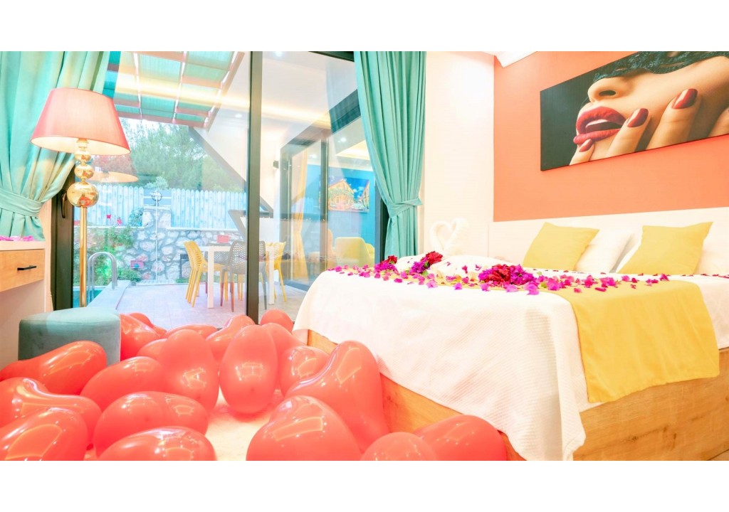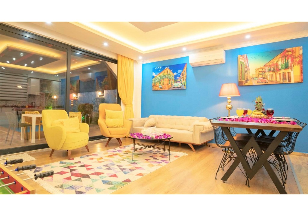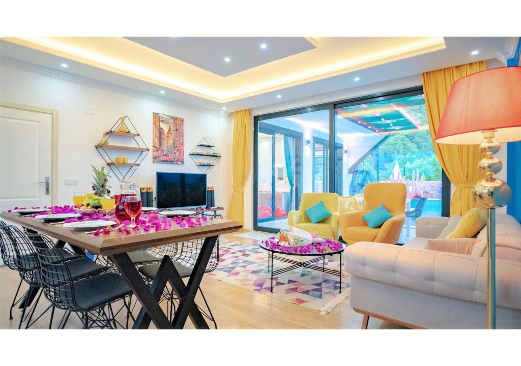 Detayları; Oturma grubu, uydu TV, klima, yemek masası ve havuz terasına çıkış bulunmaktadır.