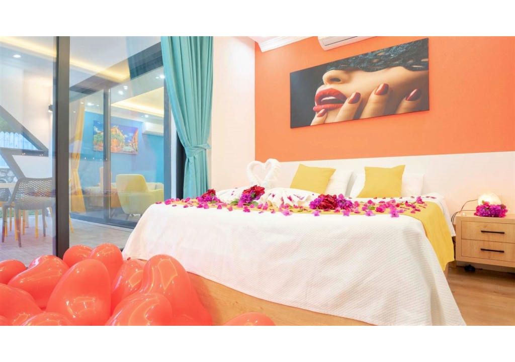 Detayları; Çift kişilik yatak, komodin, klima, elbise dolabı, banyo ve tuvalet bulunmaktadır.