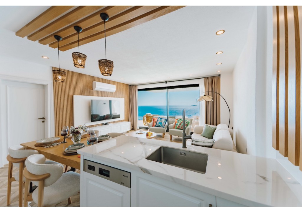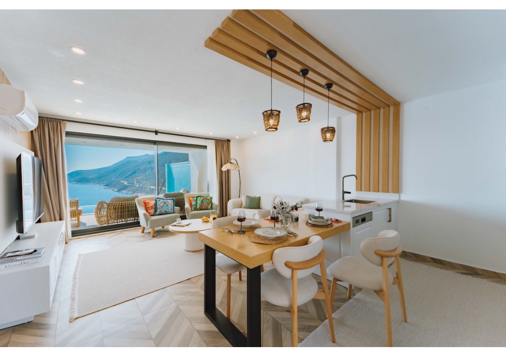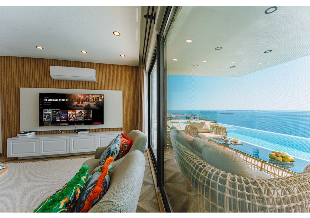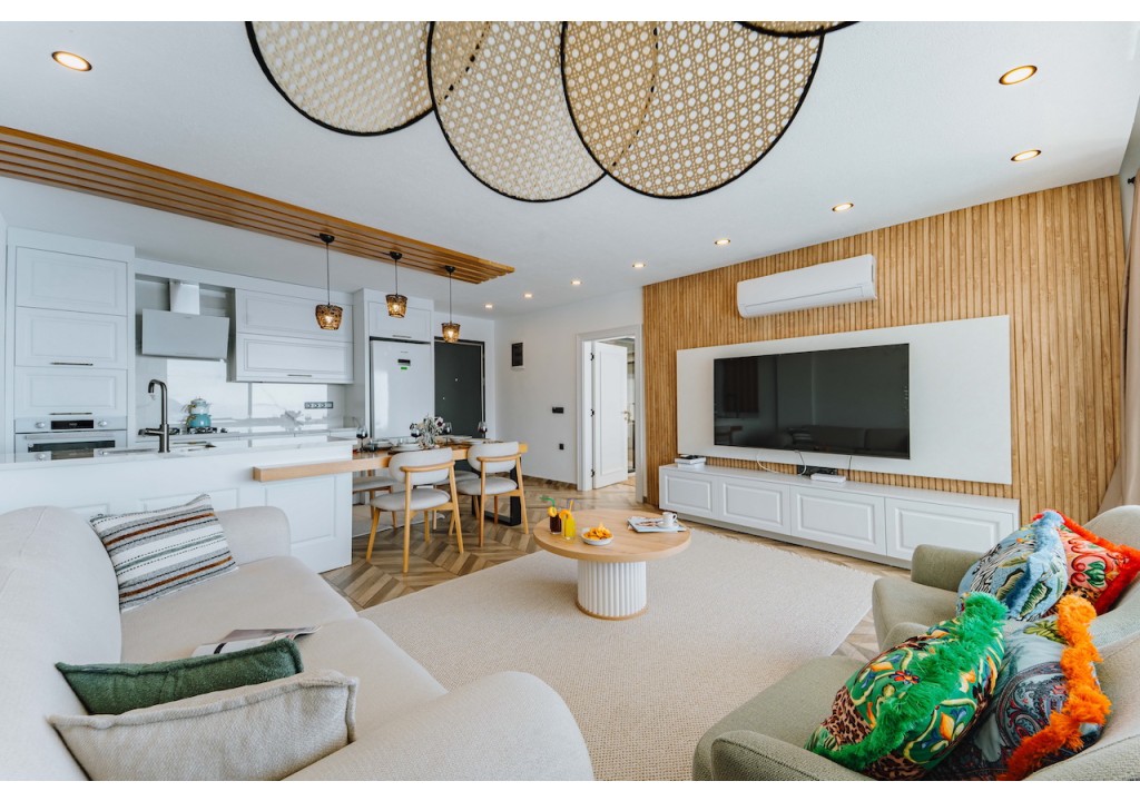 Detayları; Oturma grubu, Uydu TV (LCD), Klima, 4 kişilik yemek masası, Havuz terasına çıkış,