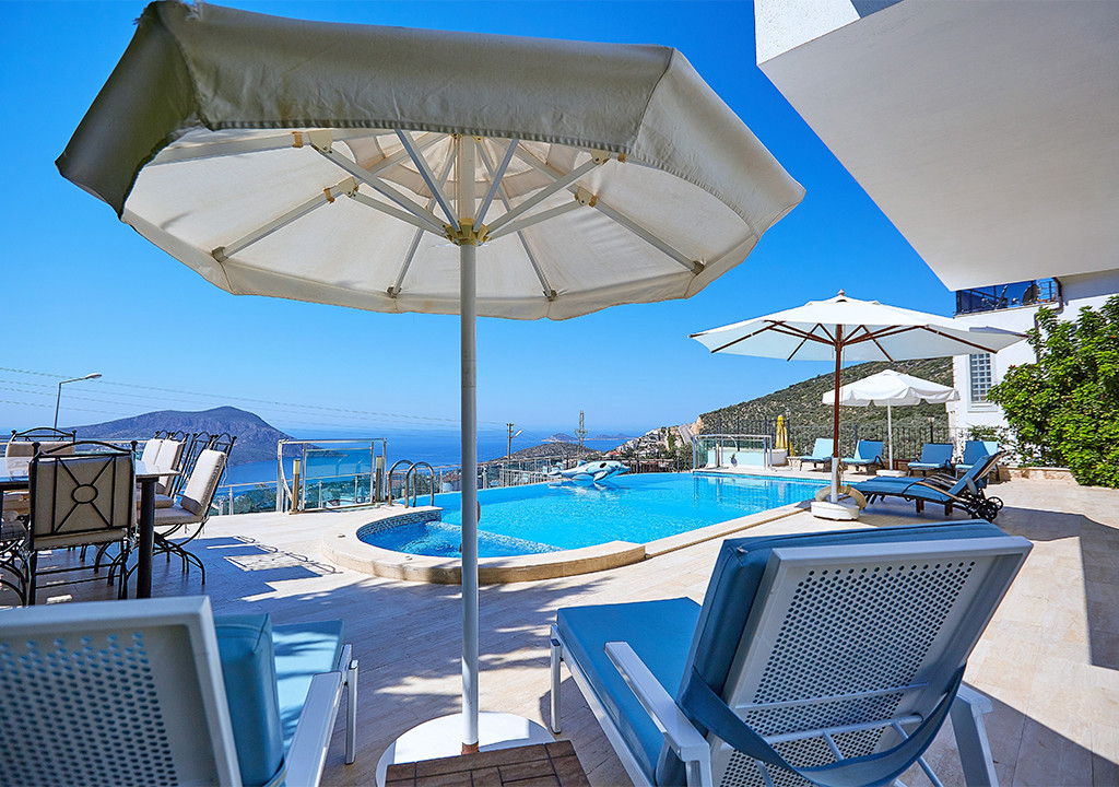 SALON: Havuz ve deniz manzaralı oturma alanı.