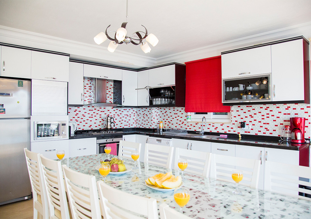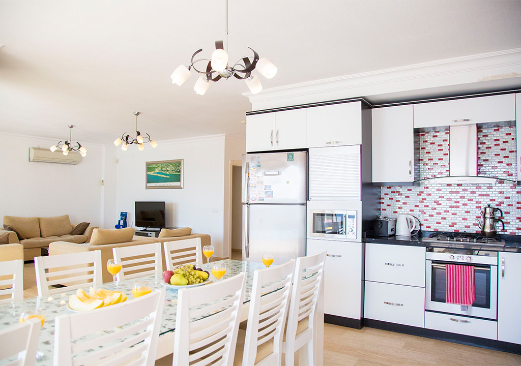 Detayları; Buzdolabı, bulaşık makinesi, fırın, 4’lü ocak, mikrodalga fırın, elektrikli su ısıtıcı, 10 kişilik yemek takımı, tava, tencereler, çatal bıçak ve mutfak ekipmanları bulunmaktadır.