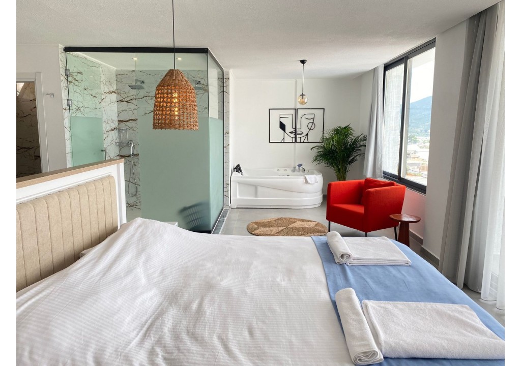 Detayları; Çift kişilik yatak, makyaj masası, komodin, klima, elbise dolabı, jakuzi, banyo ve tuvalet bulunmaktadır.
