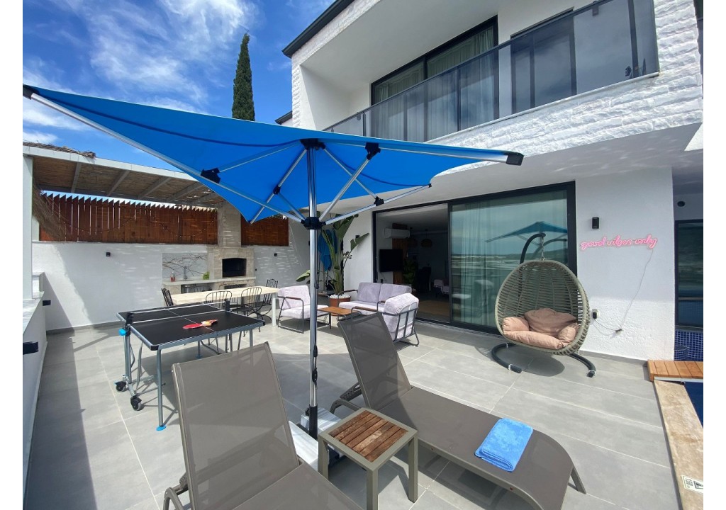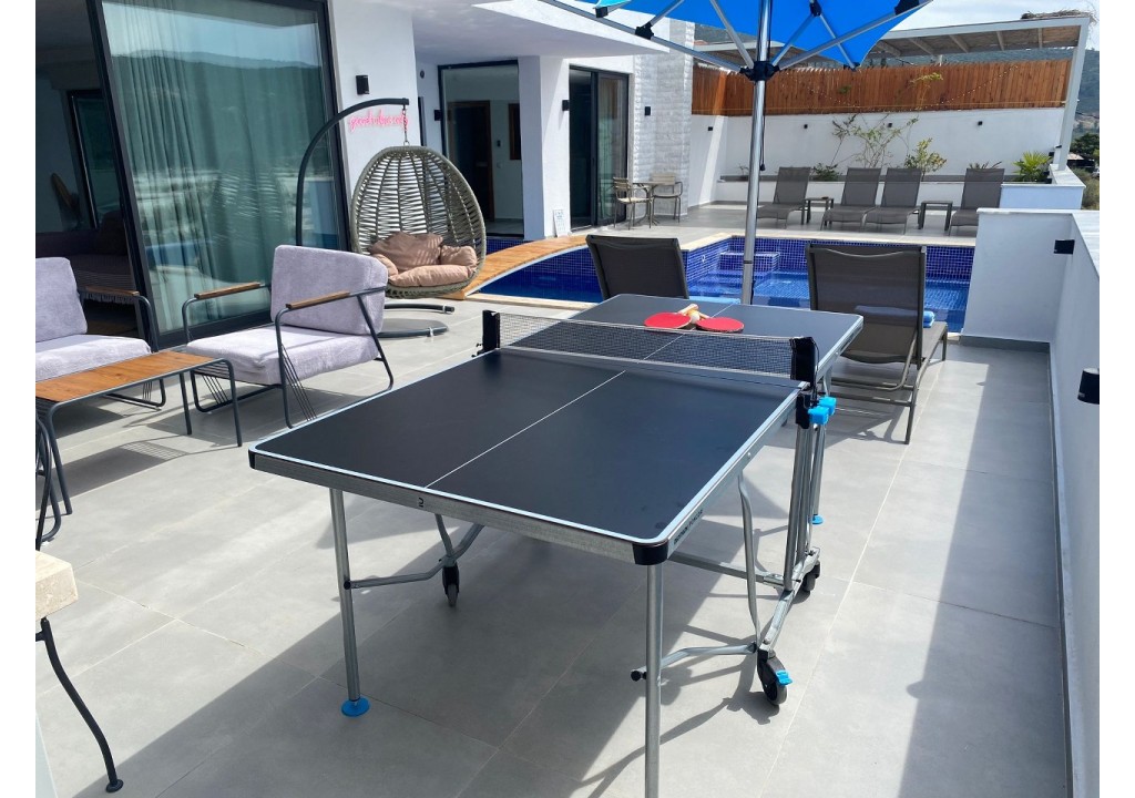 Detayları; Oturma grubu, Uydu TV (LCD), Klima, 6 kişilik yemek masası, Havuz terasına çıkış,