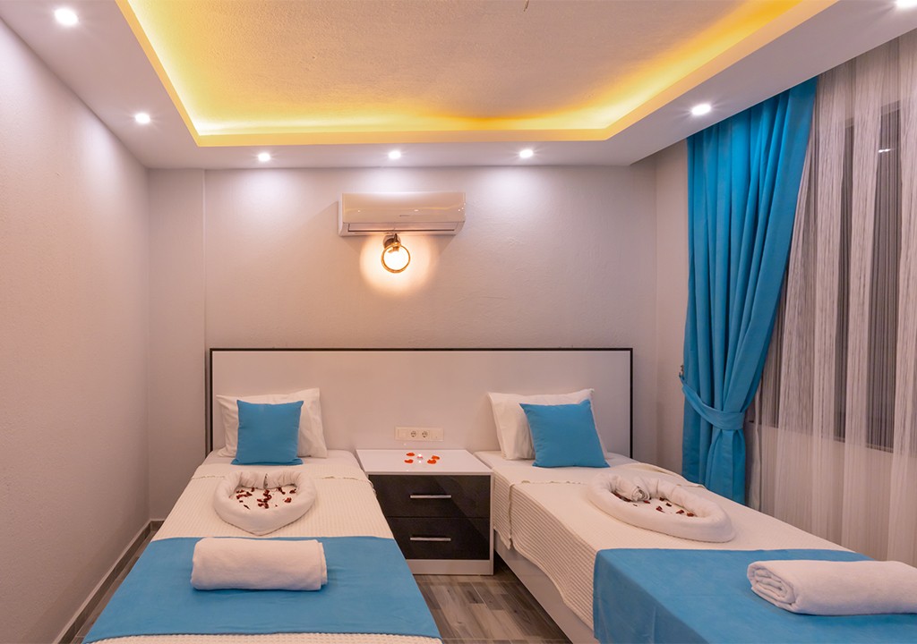 Detayları; İki adet tek kişilik yatak, makyaj masası, komodin, klima, elbise dolabı, banyo ve tuvalet bulunmaktadır.