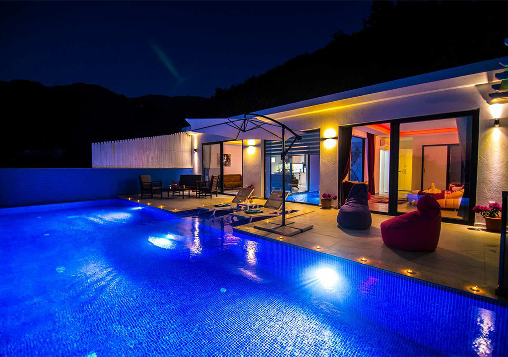 Kalkan'ın Üzümlü köyünde yer alan Dünyaca ünlü Patara plajı manzaralı Villa Art (KAL502) havuz bölgesi dışarıdan görünmeyen muhafazakar villadır.