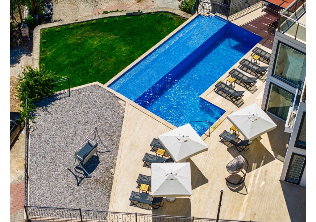 Detayları; Oturma grubu, Uydu TV (LCD), Klima, Havuz terasına çıkış,