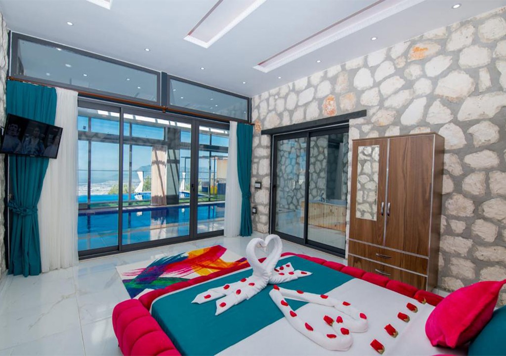 Detayları; Çift kişilik yatak, elbise dolabı, makyaj masası, klima, jakuzi, banyo ve lavabo bulunmaktadır.