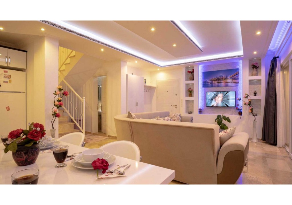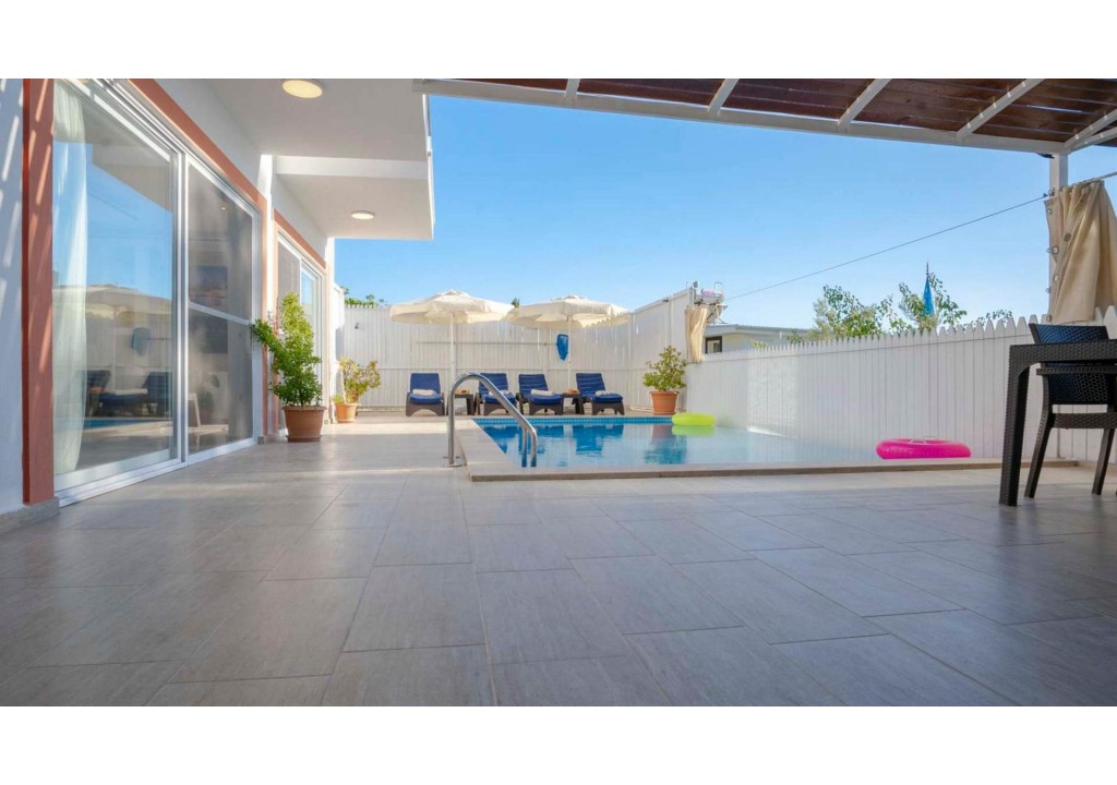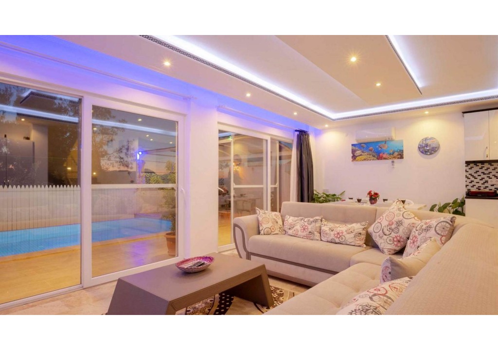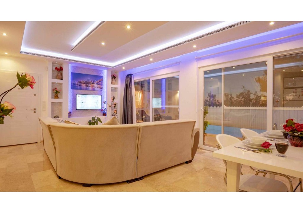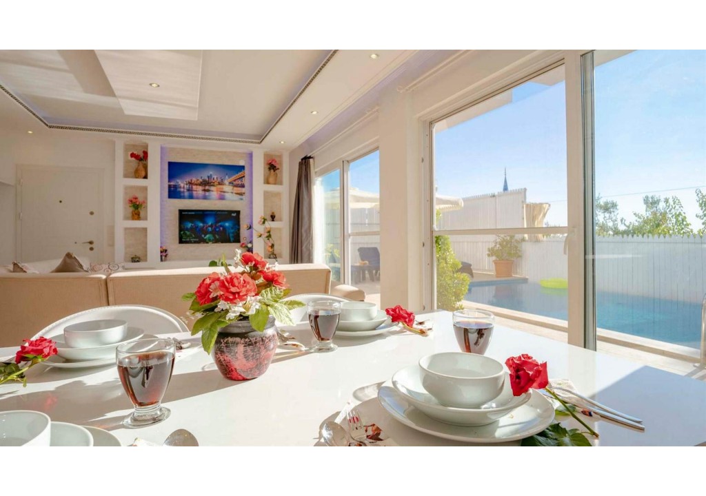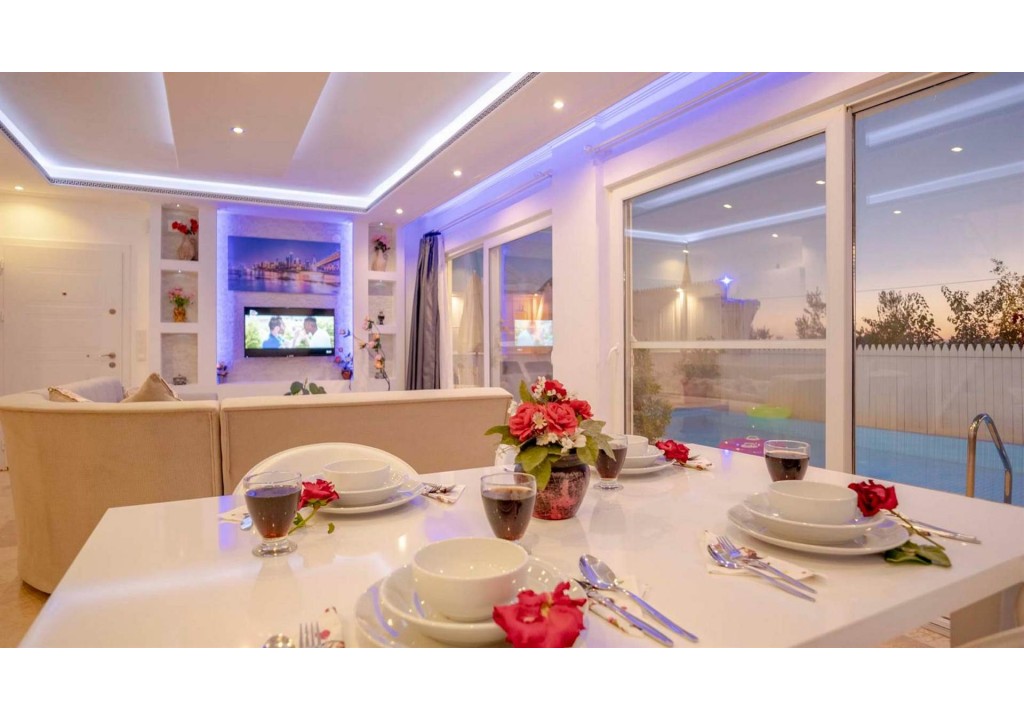 Detayları; Oturma grubu, Uydu TV (LCD), Klima, 4 kişilik yemek masası, Havuz terasına çıkış,