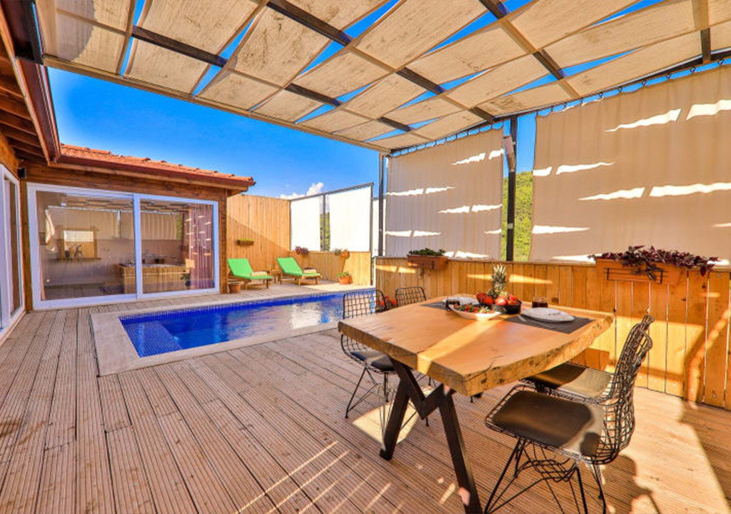 Kalkan’ın Patara bölgesinde bulunan 1 yatak odalı Patara manzaralı villamız, havuz bölgesi dışarıdan görünmeyen muhafazakar bir villadır.