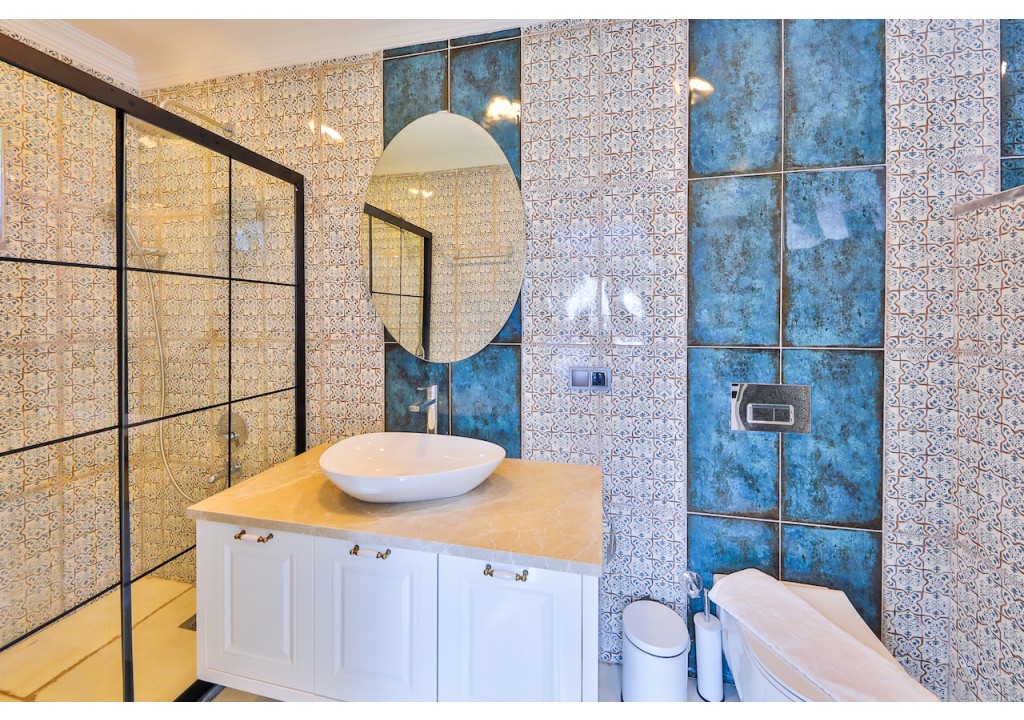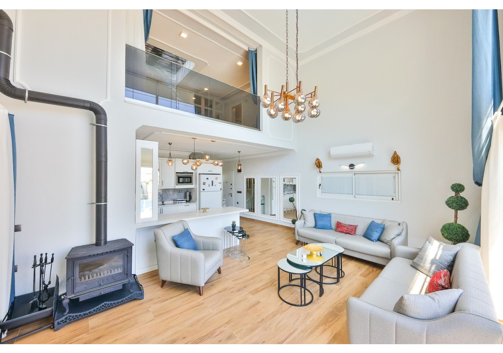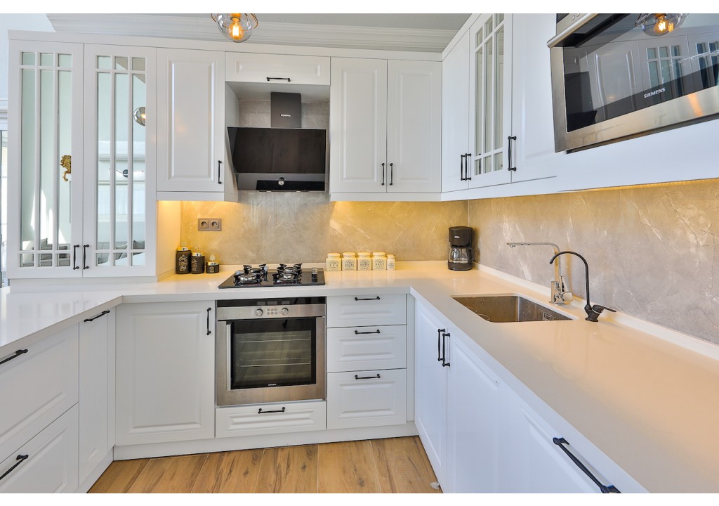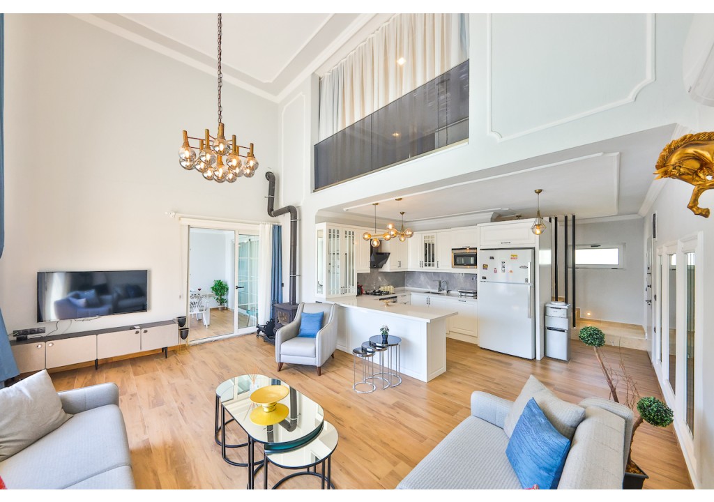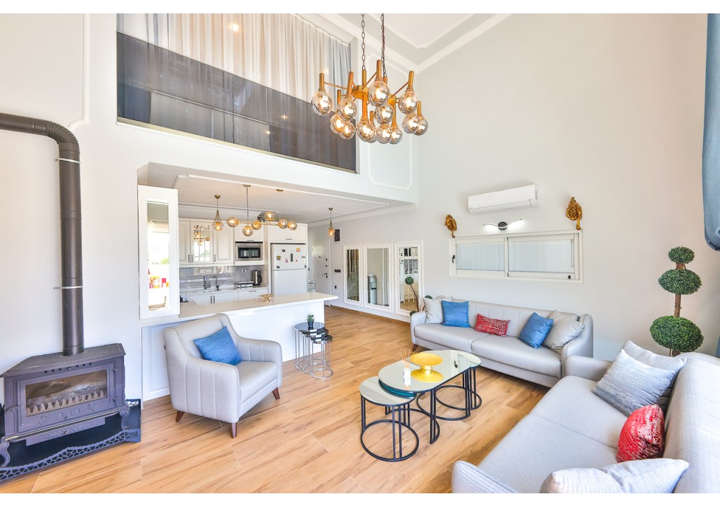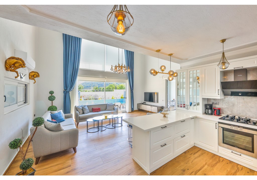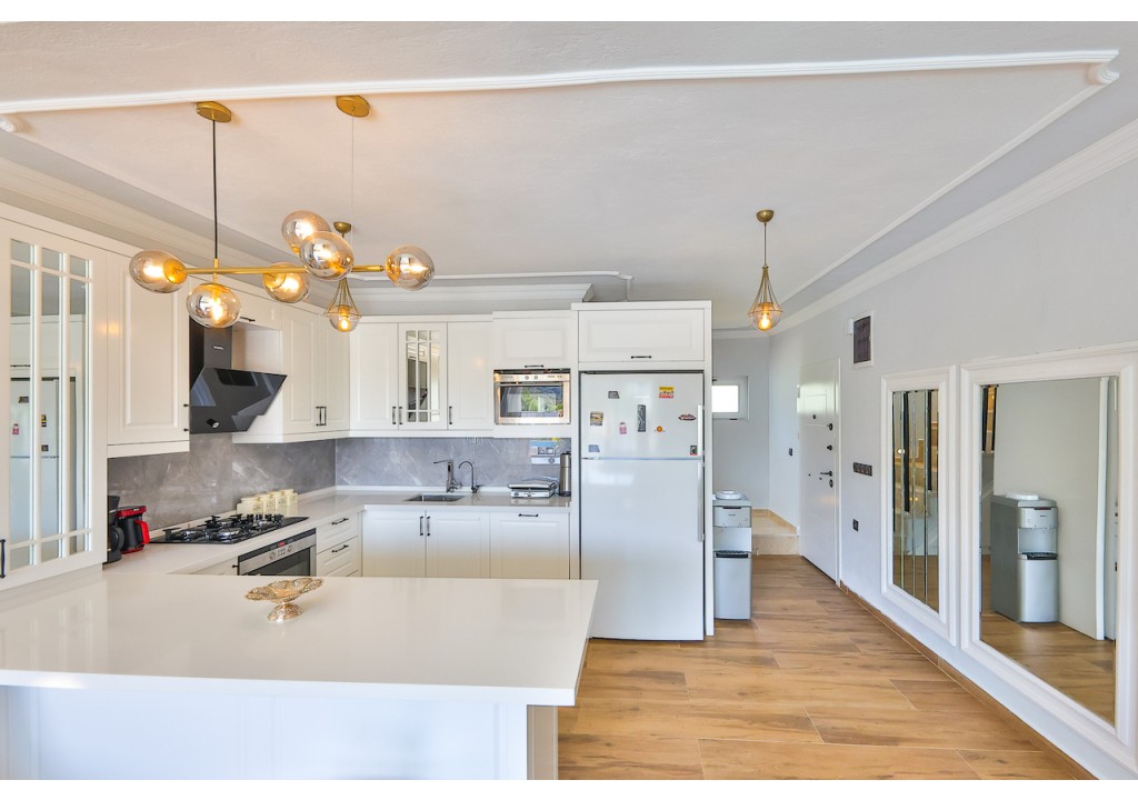 Detayları; Amerikan tarzı mutfak içerisinde buzdolabı, bulaşık makinesi, çamaşır makinesi, fırın, kahve makinesi, 4’lü ocak (ankastre), mikrodalga fırın, elektrikli su ısıtıcı, tava & tencere vb. mutfak ekipmanları ve yemek takımı bulunmaktadır.