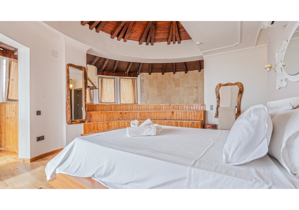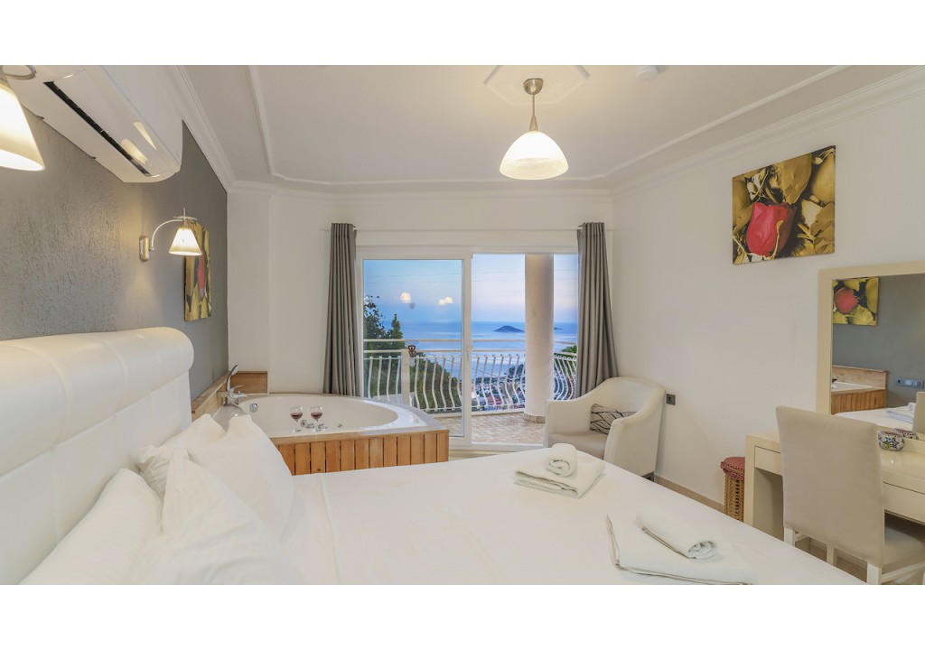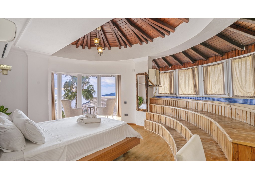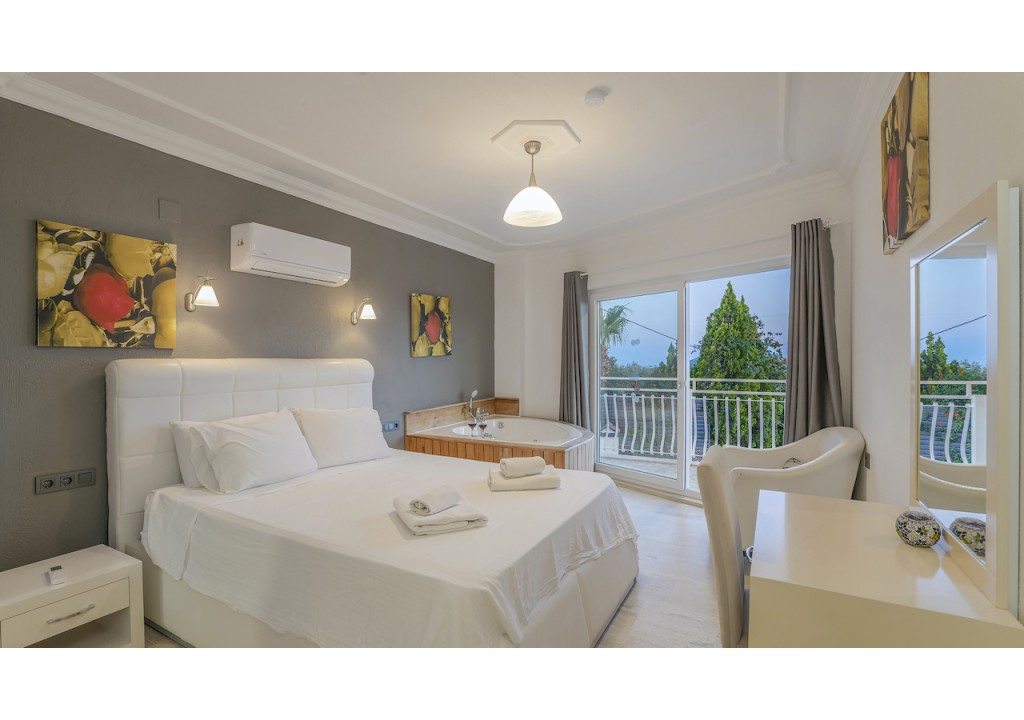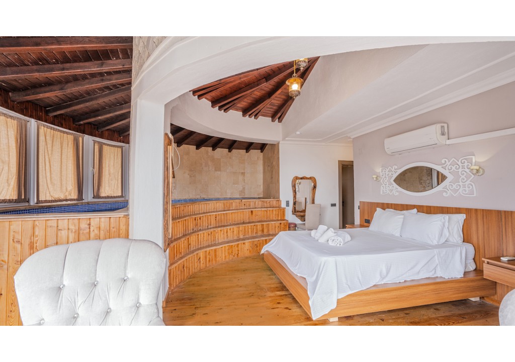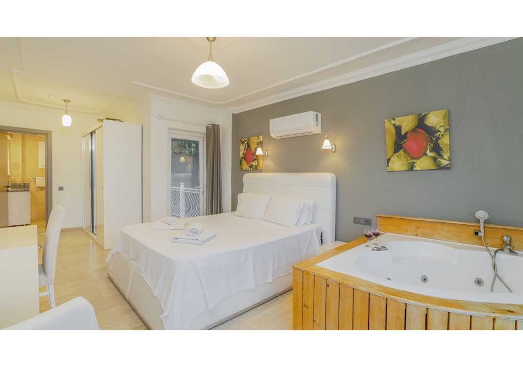 Detayları; 1 adet çift kişilik yuvarlak yatak, elbise dolabı, komodin, makyaj masası, klima, jakuzili ısıtmalı kapalı havuz, banyo&Wc, balkona çıkış bulunmaktadır.