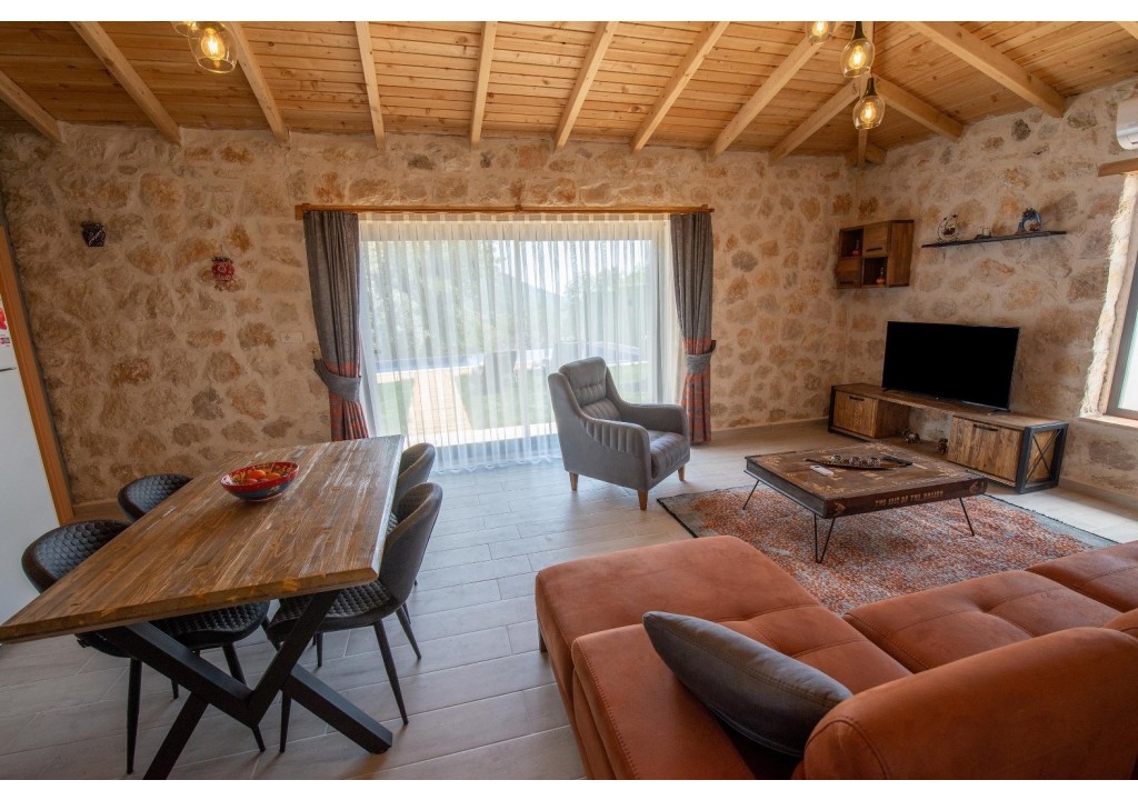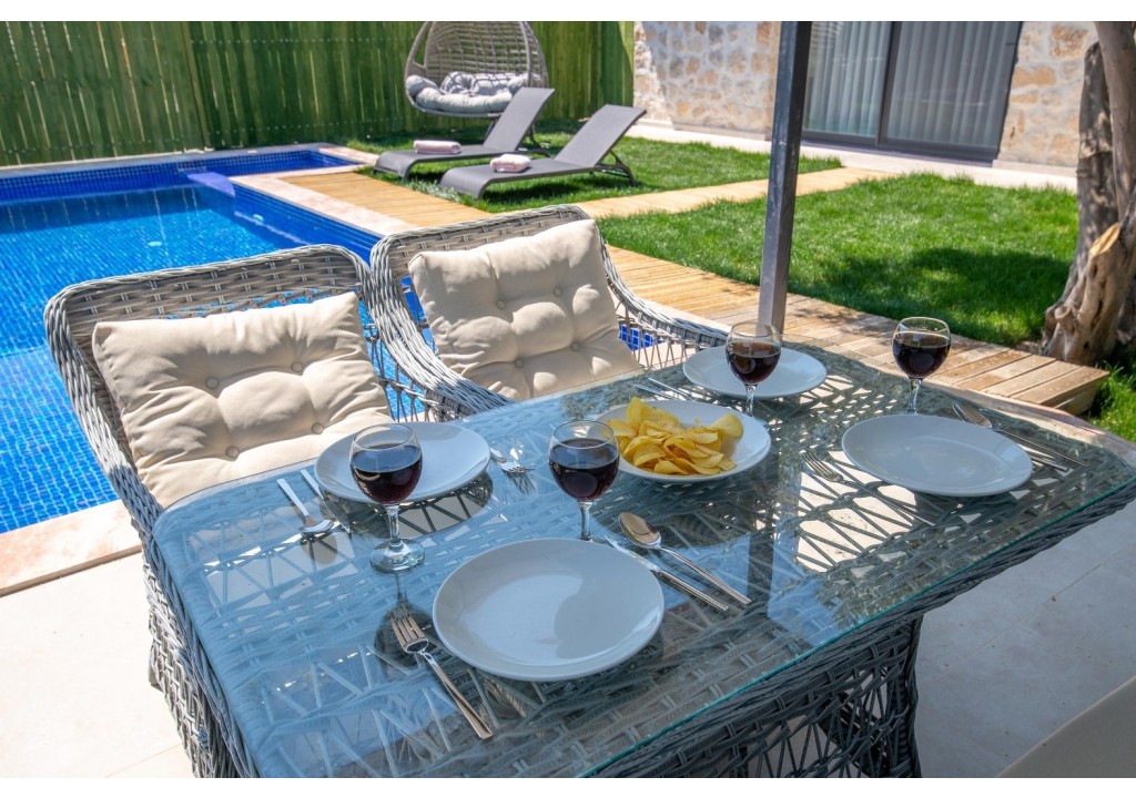 Detayları; Oturma grubu, Uydu TV (LCD), Klima, 4 kişilik yemek masası, Havuz terasına çıkış,