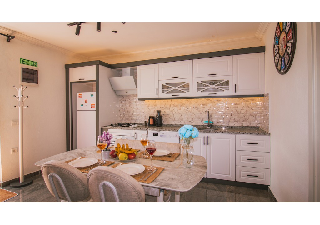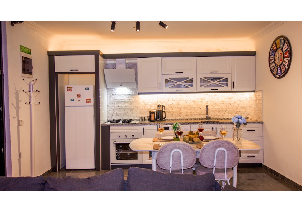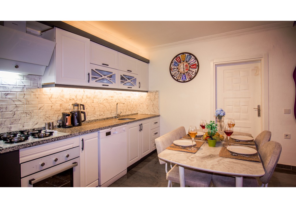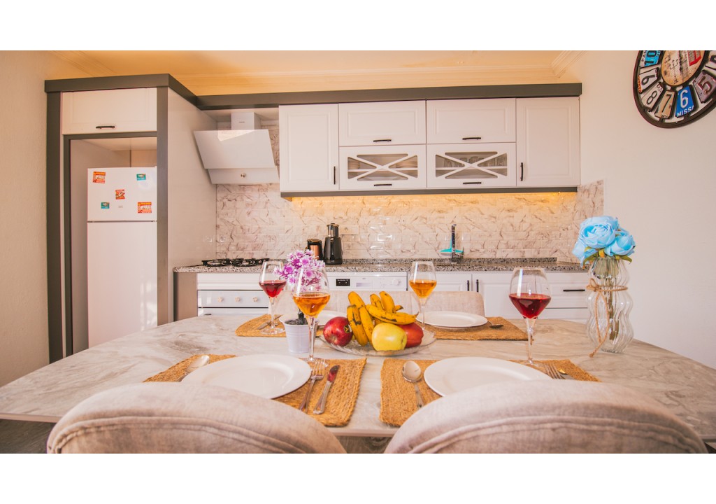 Detayları; Buzdolabı, Bulaşık makinesi, Fırın 4’lü Ocak (ankastre), Mikrodalga fırın, Elektrikli su ısıtıcı, 4 kişilik yemek takımı, Tava, Tencereler, Çatal bıçak vb.