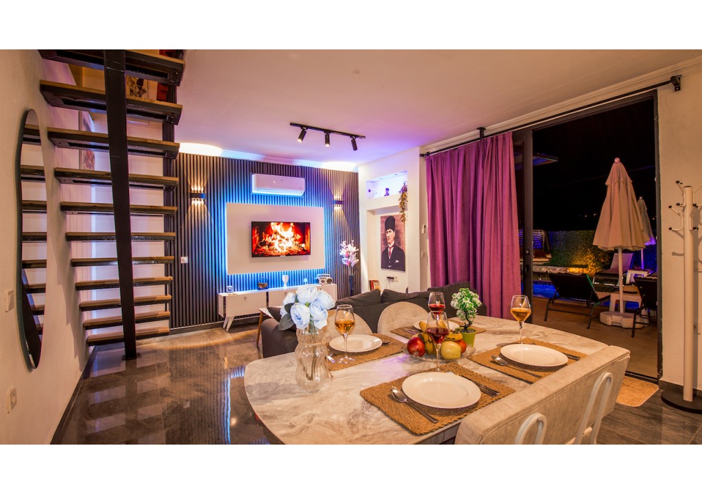 Detayları; Oturma grubu, Uydu TV (LCD), Klima, 4 kişilik yemek masası, Havuz terasına çıkış