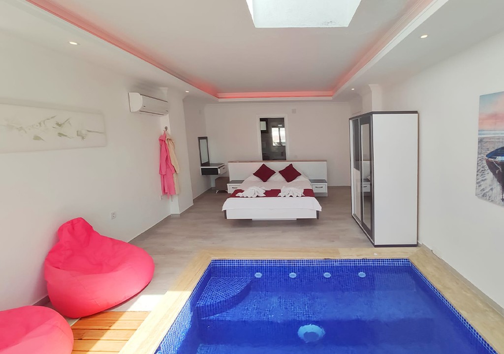 Detayları; Çift kişilik yatak, makyaj masası, komodin, klima, elbise dolabı, jakuzi,kapalı ısıtmalı havuz,banyo ve tuvalet bulunmaktadır.