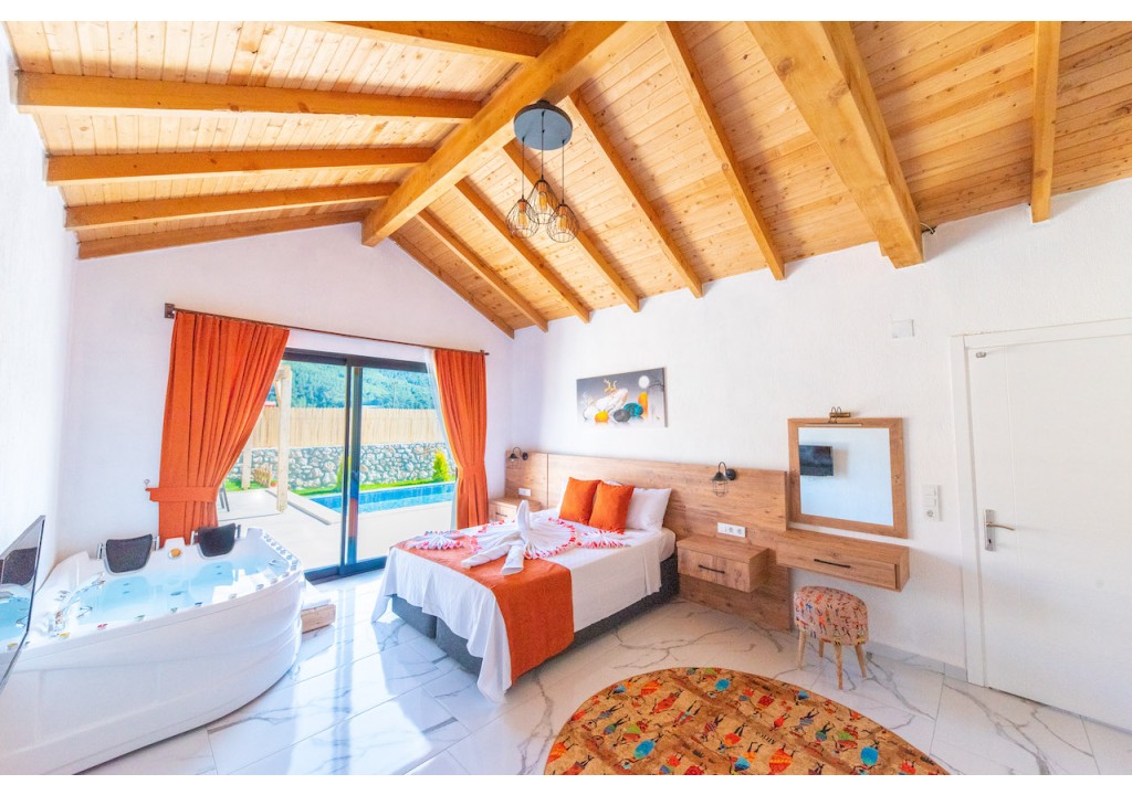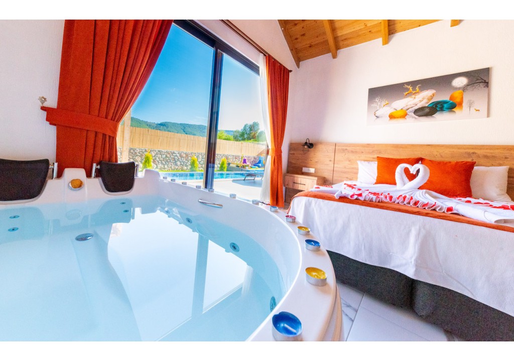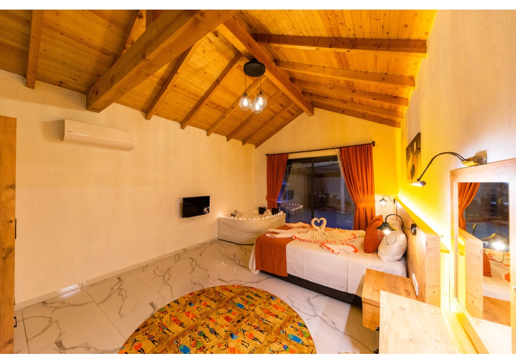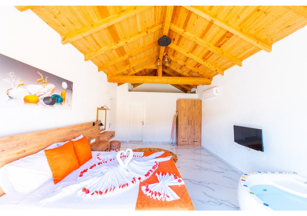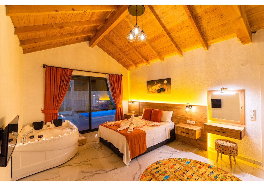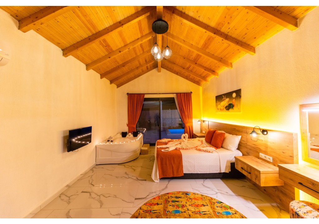 Detayları; Çift kişilik yatak, makyaj masası, komidin, klima, elbise dolabı, jakuzi, banyo ve tuvalet bulunmaktadır.