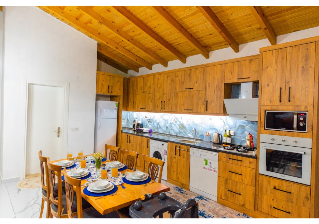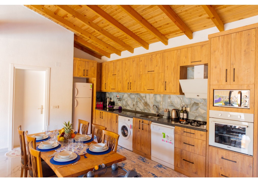 Detayları; Buz dolabı, Bulaşık makinesi, Fırın 4’lü Ocak (ankastre), Mikrodalga fırın, Elektrikli su ısıtıcı, su sebili, 6 kişilik yemek takımı, Tava, Tencereler, Çatal bıçak vb.