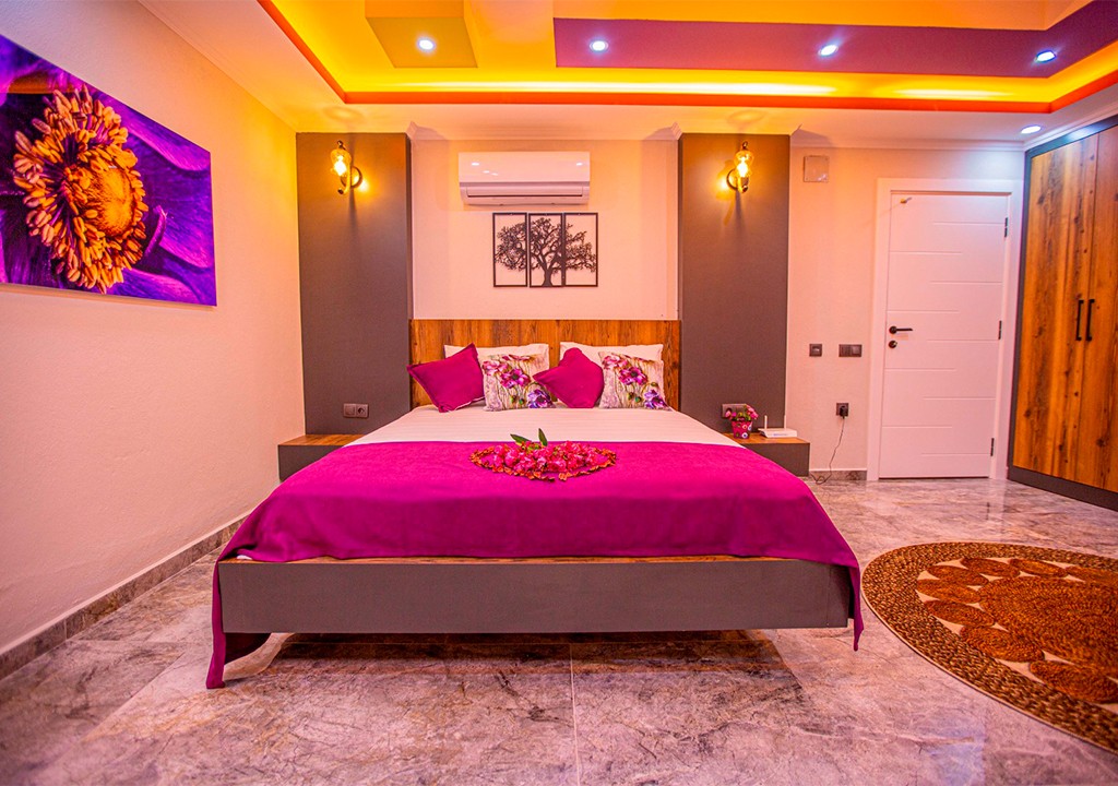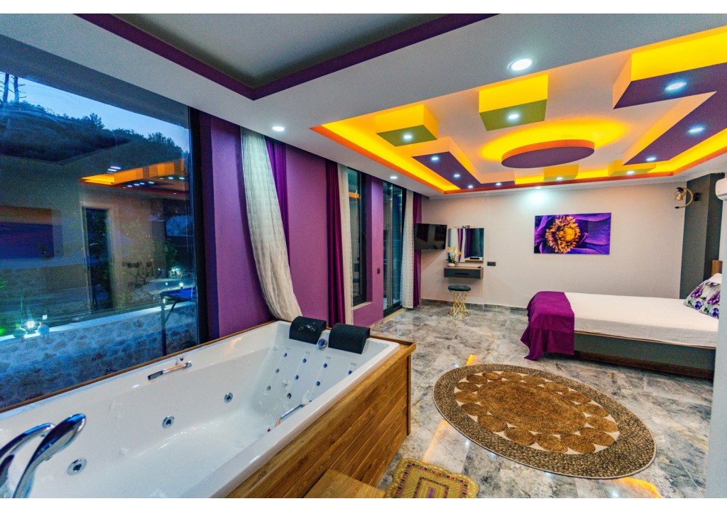 Detayları; Çift kişilik yatak, makyaj masası, komodin, klima, elbise dolabı, jakuzi, banyo ve tuvalet bulunmaktadır.
