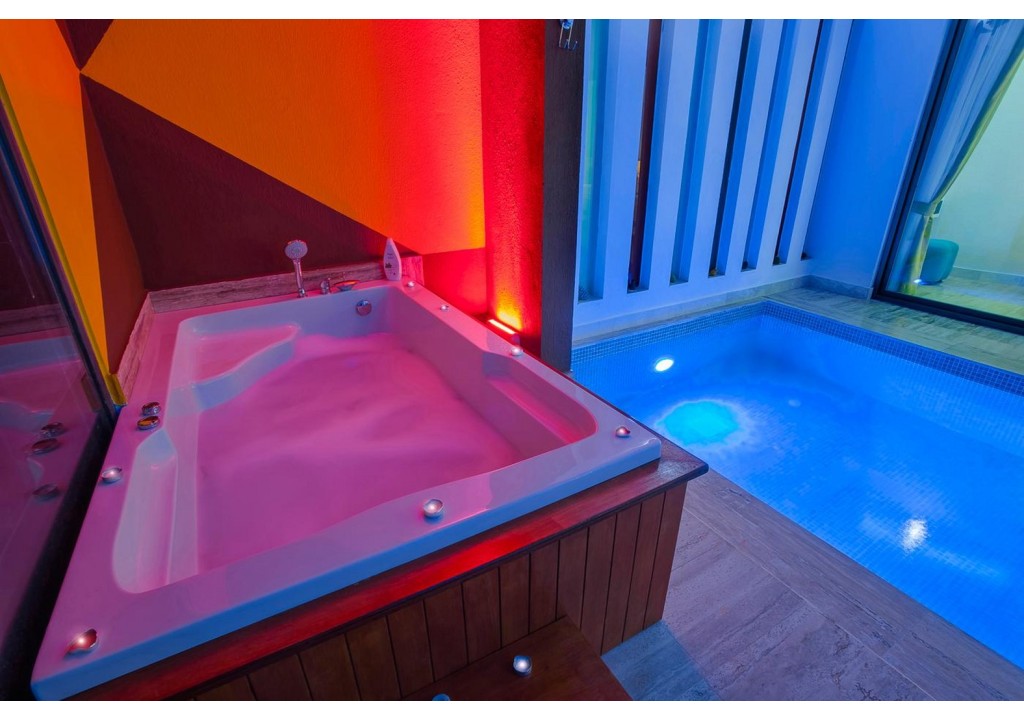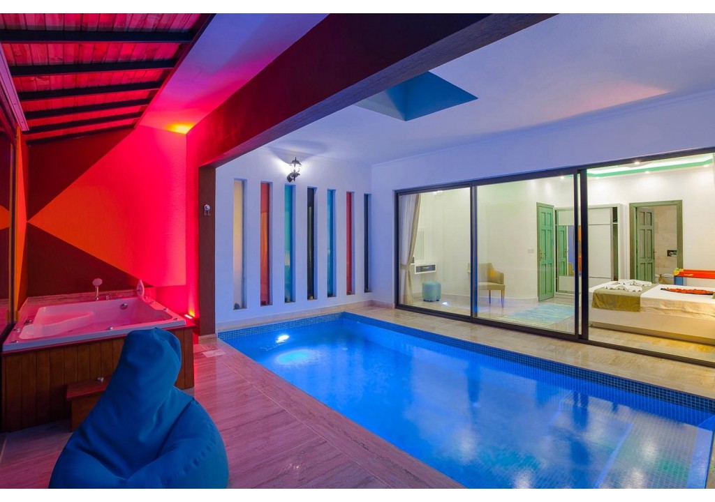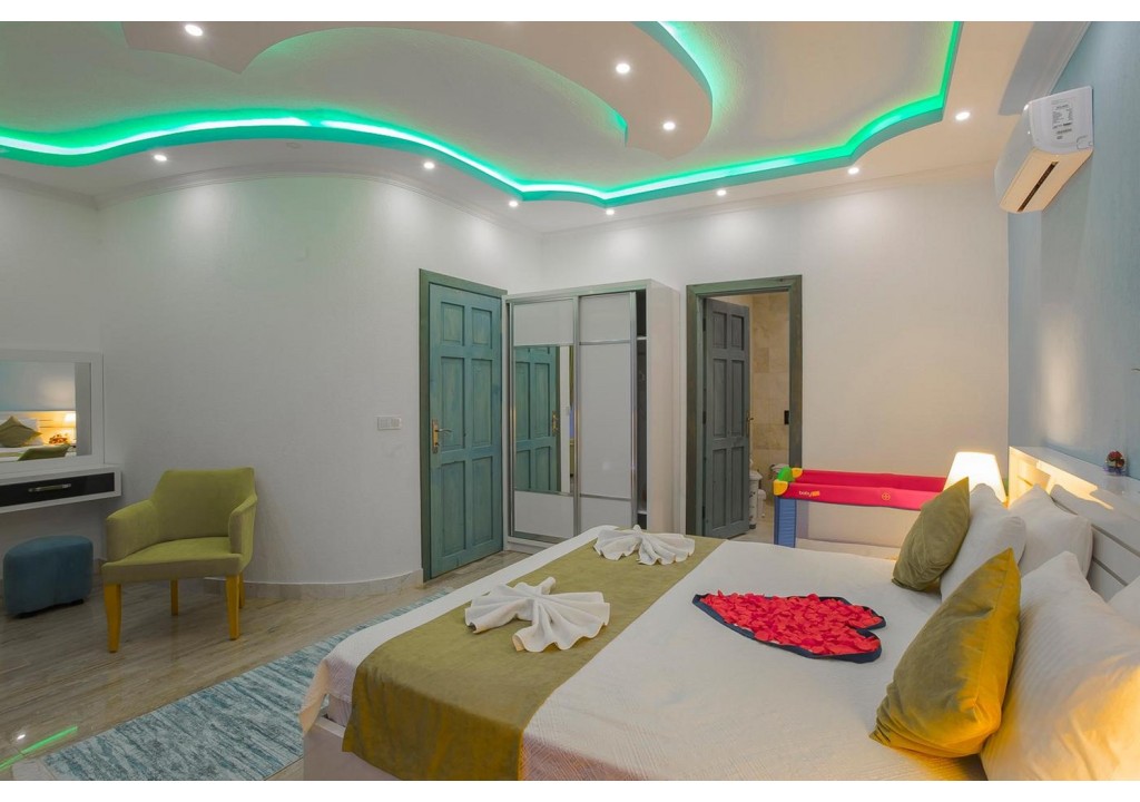 Detayları; Çift kişilik yatak makyaj masası, komodin, klima, elbise dolabı, jakuzi, banyo ve tuvalet bulunmaktadır.