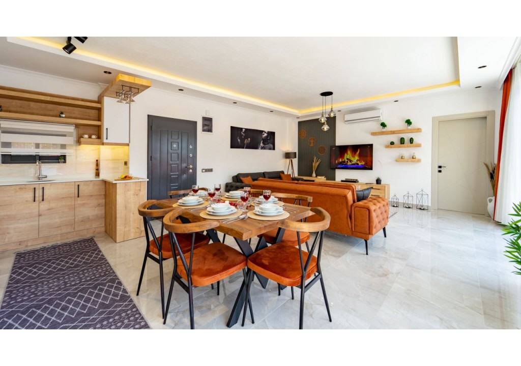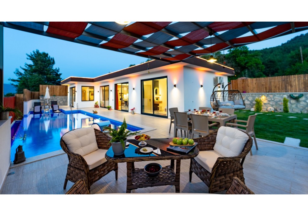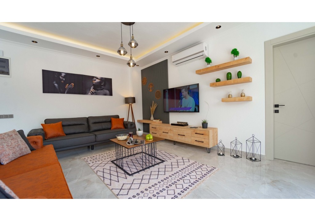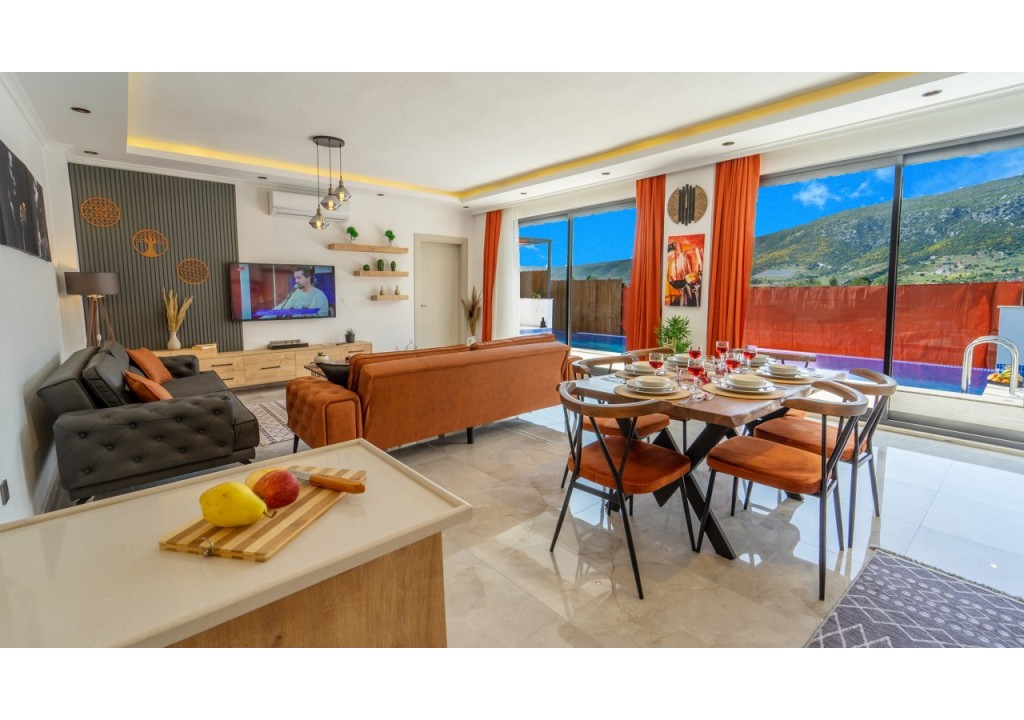 Detayları; Oturma grubu, Uydu TV (LCD), Klima, 4 kişilik yemek masası, Havuz terasına çıkış,
