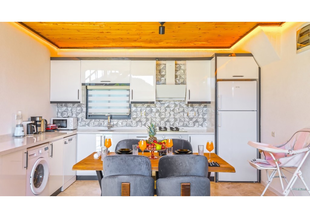 Detayları; Buzdolabı, bulaşık makinesi, fırın, 4’lü ocak, mikrodalga fırın, elektrikli su ısıtıcı, yemek takımı, tava, tencereler, çatal bıçak ve mutfak ekipmanları bulunmaktadır.