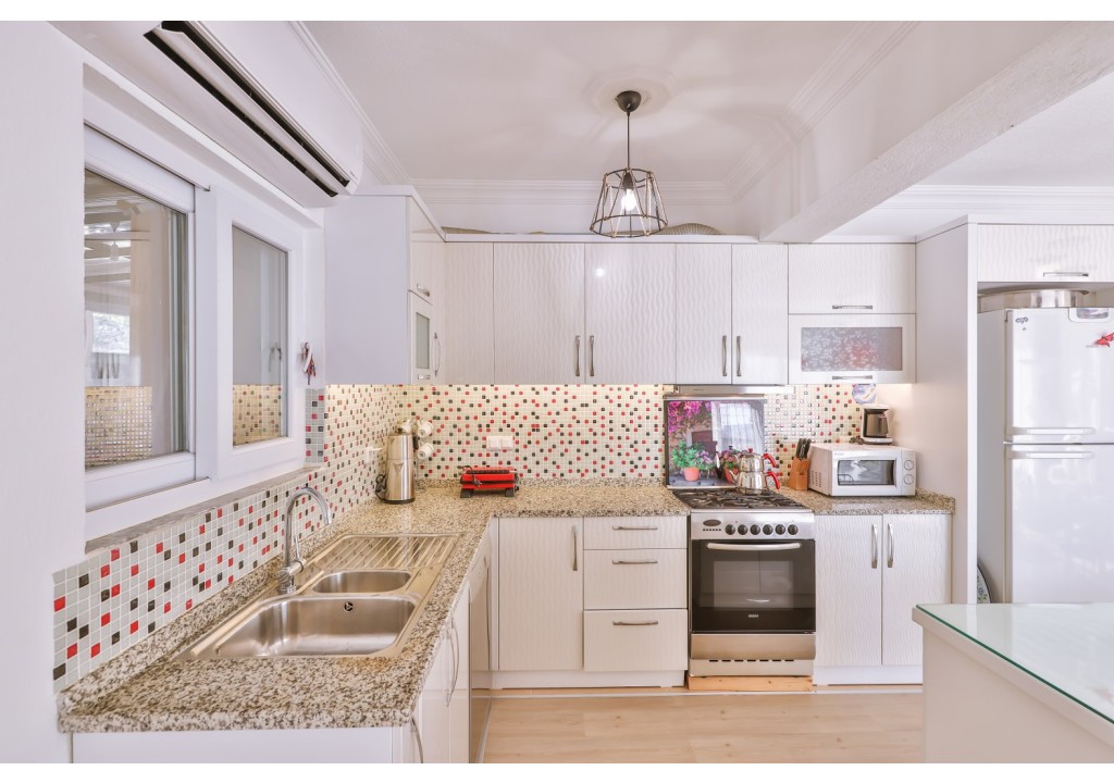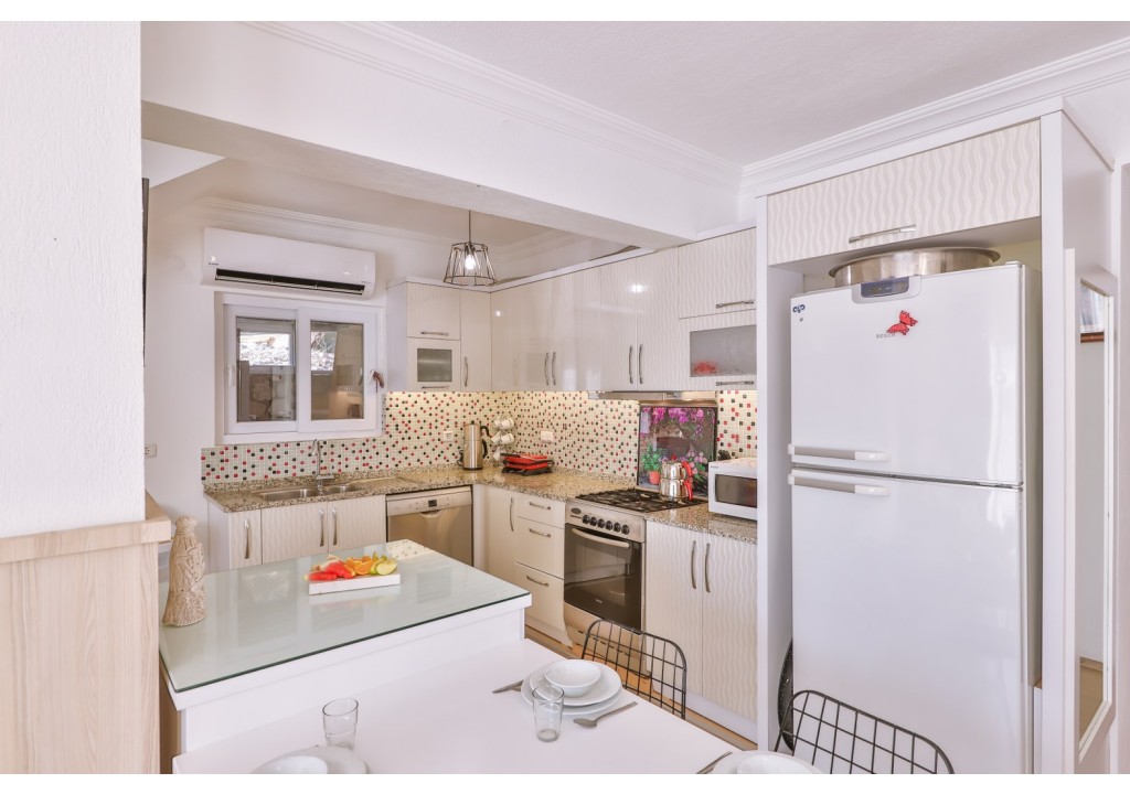 Detayları; Buzdolabı, Bulaşık makinesi, Fırın 4’lü Ocak (ankastre), Mikrodalga fırın, Elektrikli su ısıtıcı, 10 kişilik yemek takımı, Tava, Tencereler, Çatal bıçak vb.