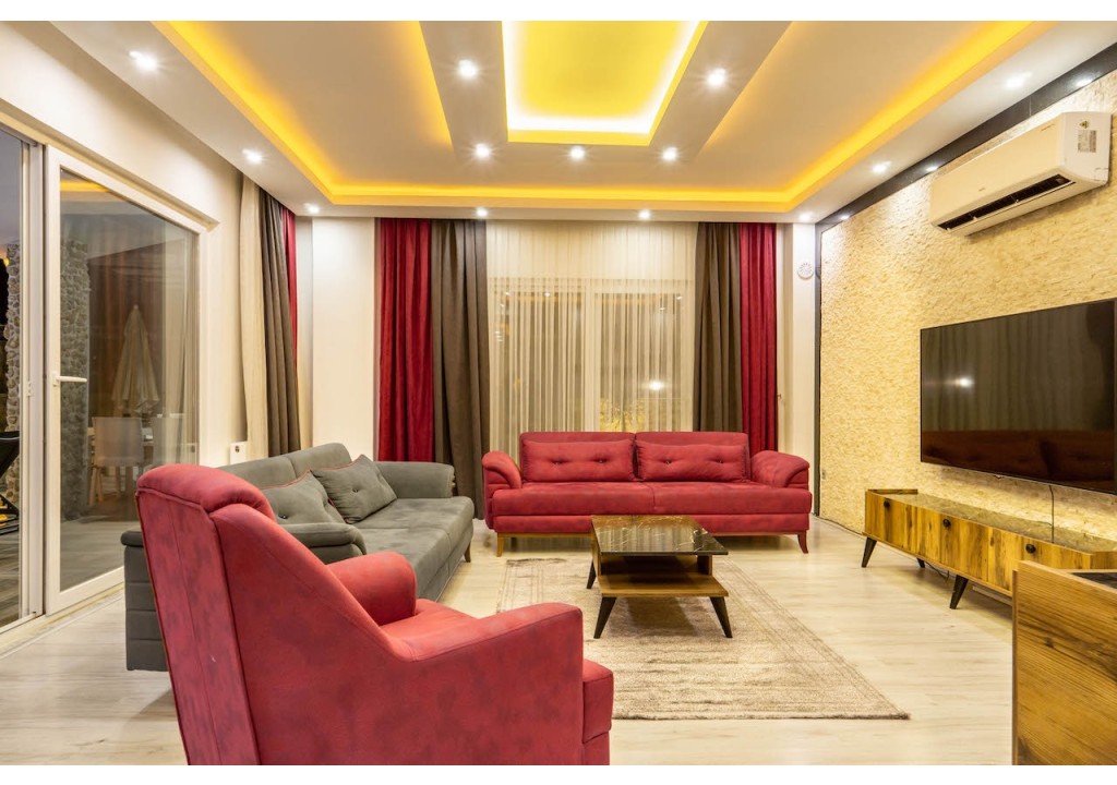 Detayları; Oturma grubu, Uydu TV (LCD), Klima, 6 kişilik yemek masası, Havuz terasına çıkış,