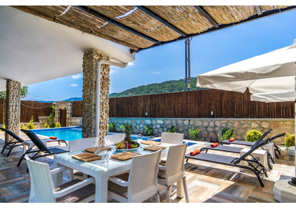 Detayları; Şezlonglar, güneş şemsiyesi, 6 kişilik yemek masası, oturma grubu.