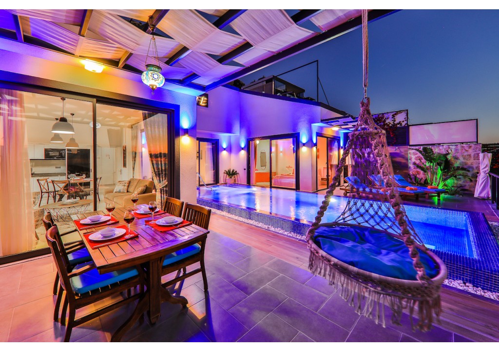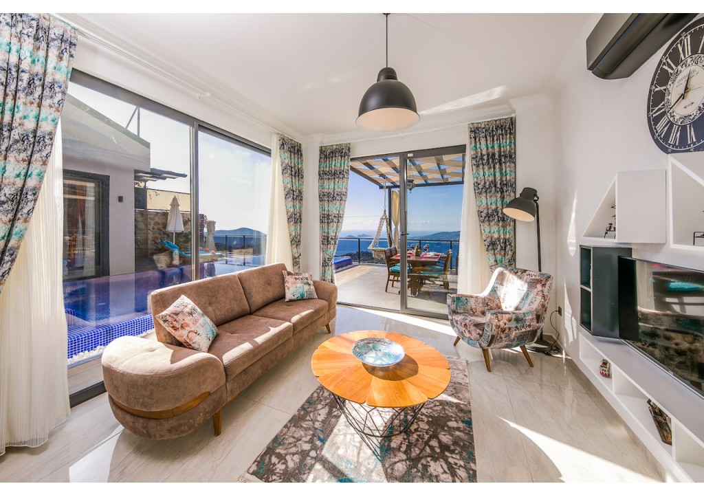 Detayları; Oturma grubu, Uydu TV (LCD), Klima, 4 kişilik yemek masası, Havuz terasına çıkış,