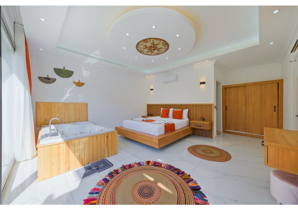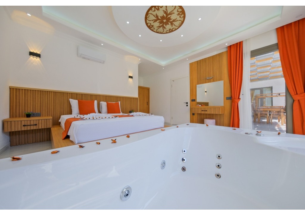 Detayları; Çift kişilik yatak, makyaj masası, komidin, klima, elbise dolabı, jakuzi, banyo ve tuvalet bulunmaktadır.