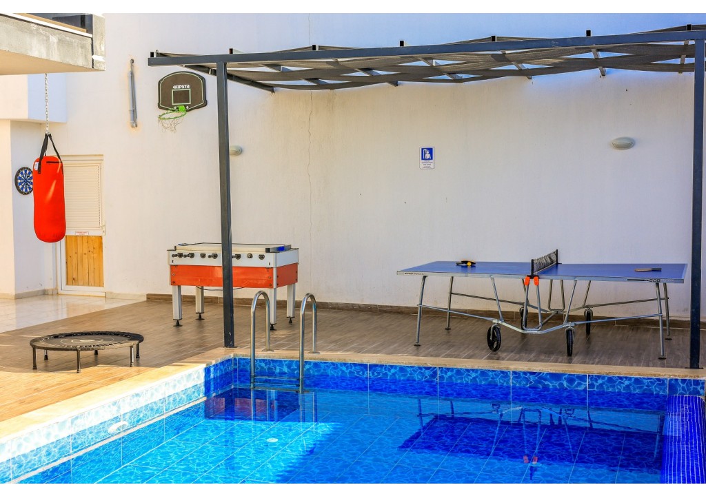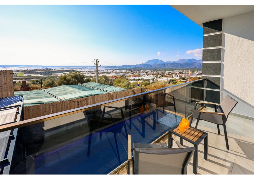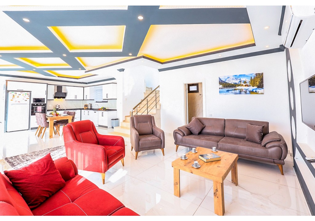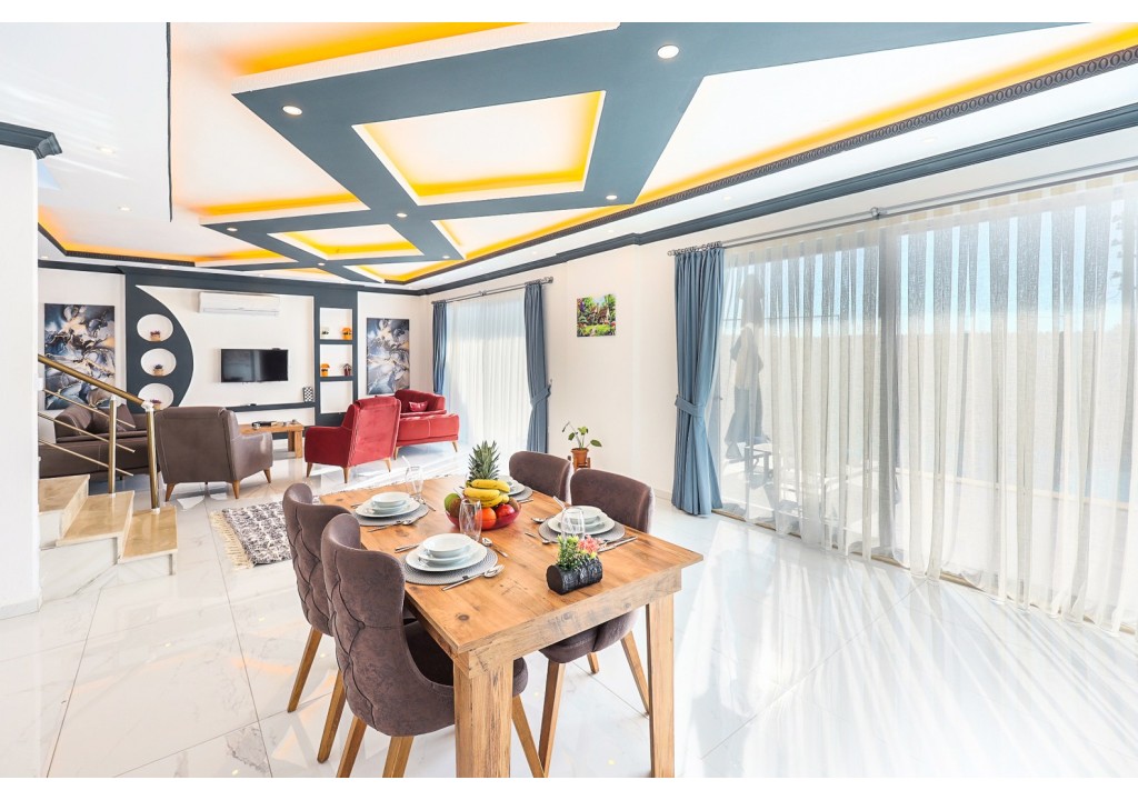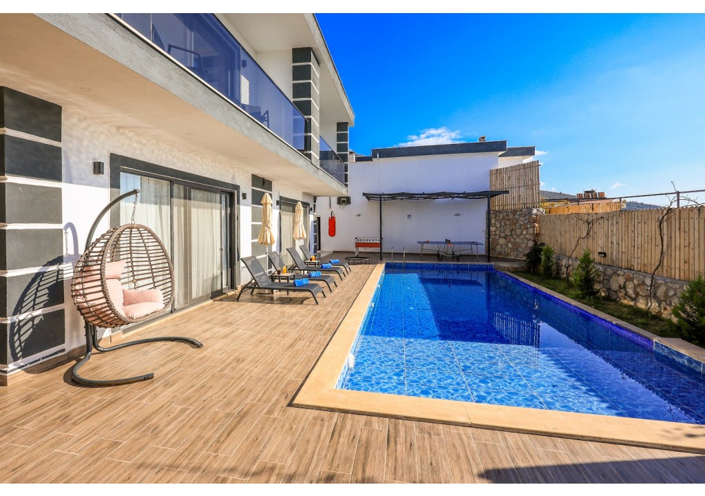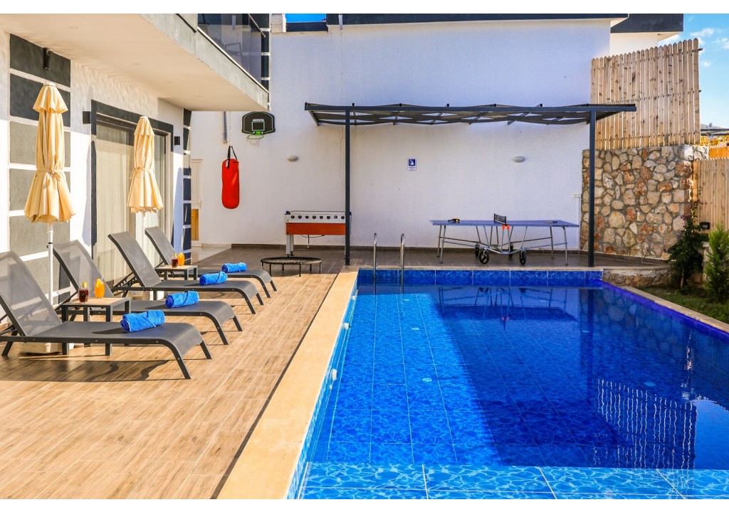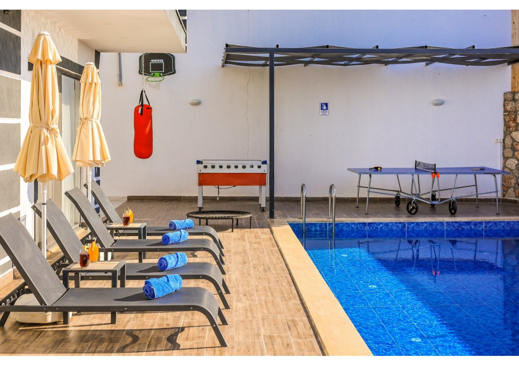 Detayları; Oturma grubu, Uydu TV (LCD), Klima, 4 kişilik yemek masası, Havuz terasına çıkış,