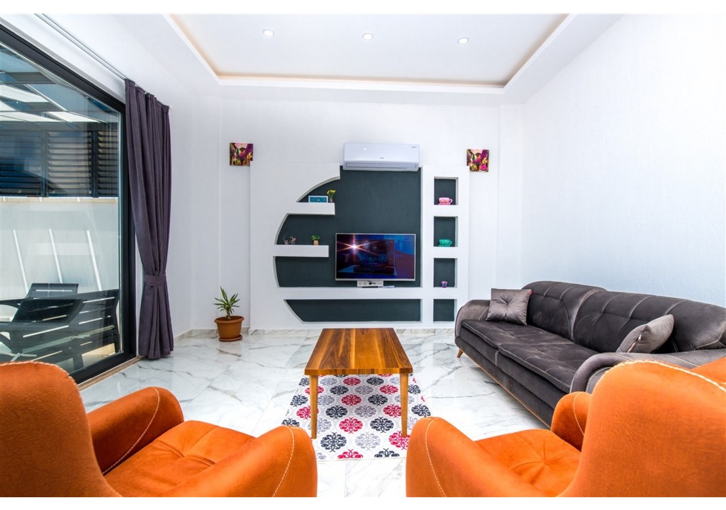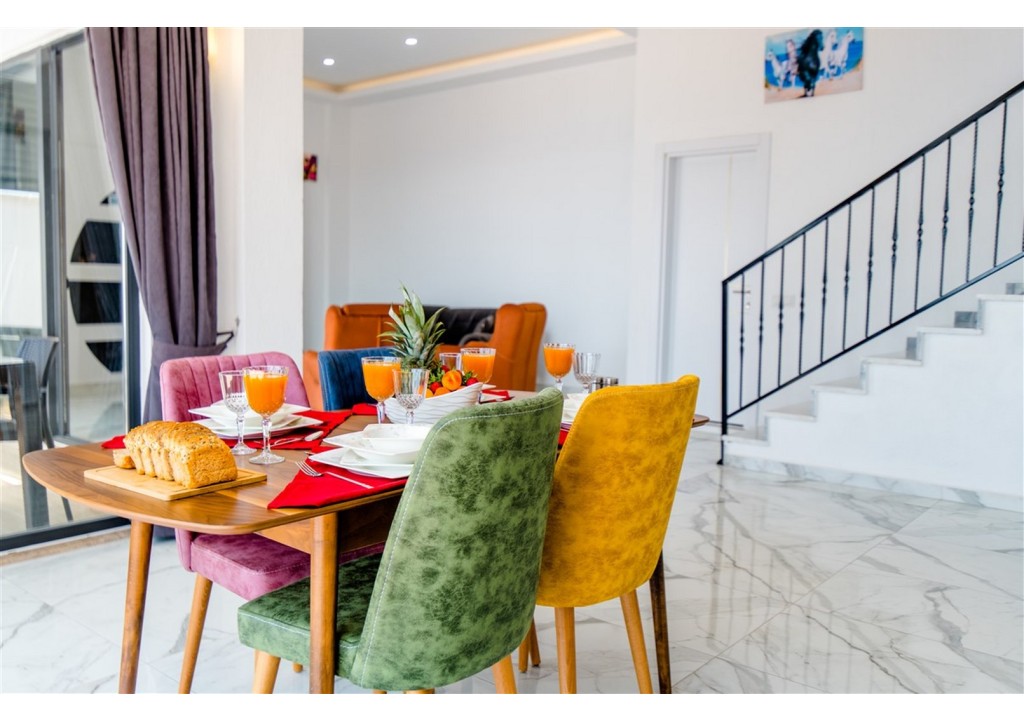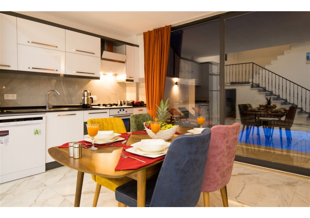 Detayları; Oturma grubu, Uydu TV (LCD), Klima, 4 kişilik yemek masası, Havuz terasına çıkış