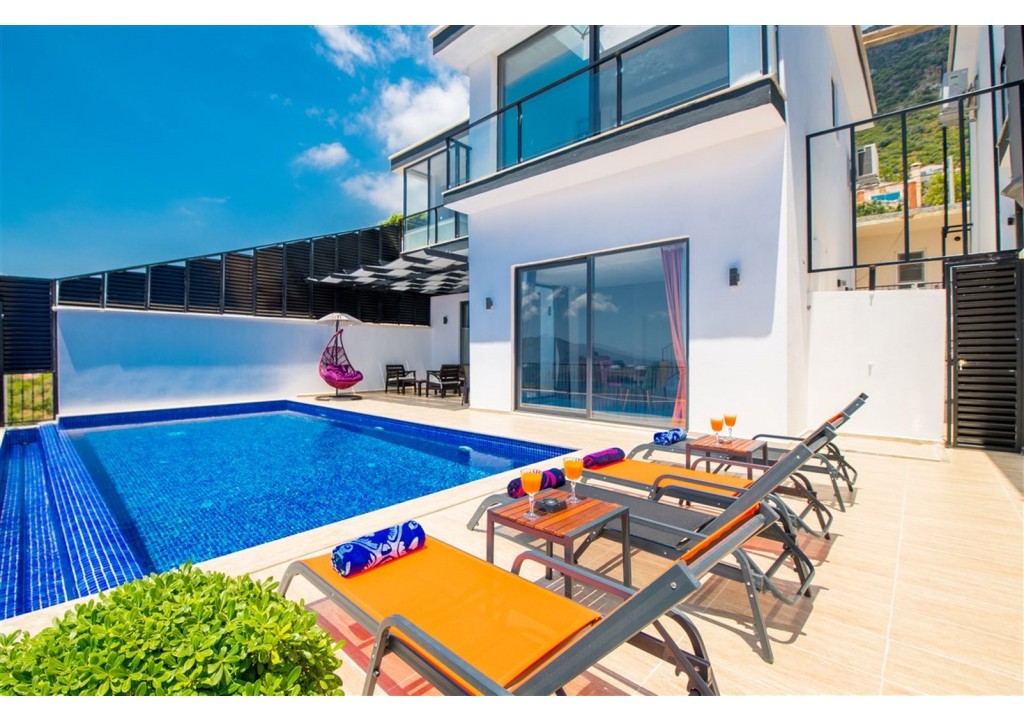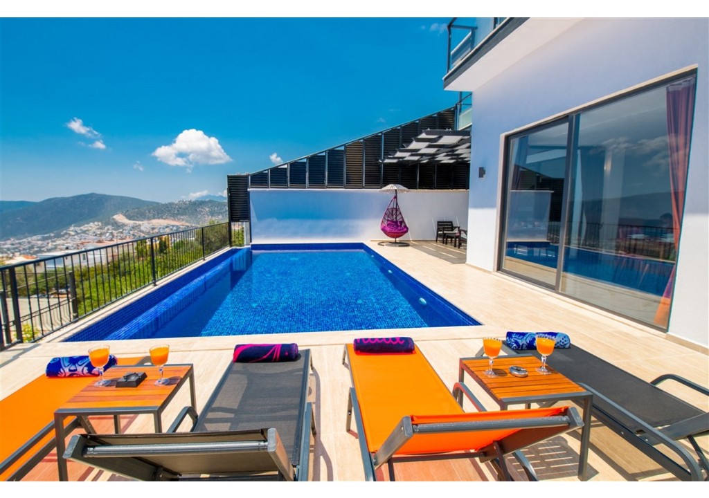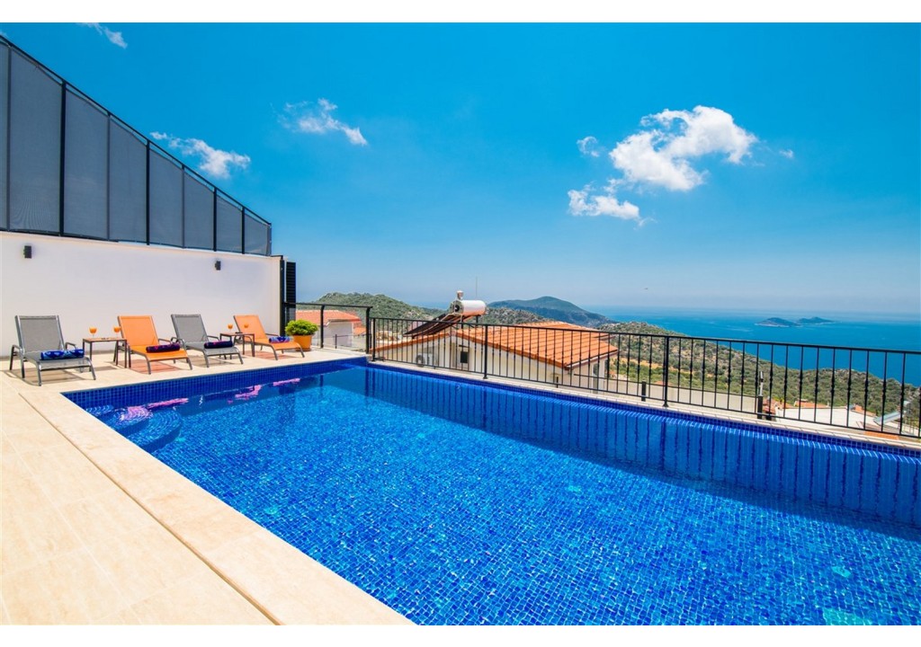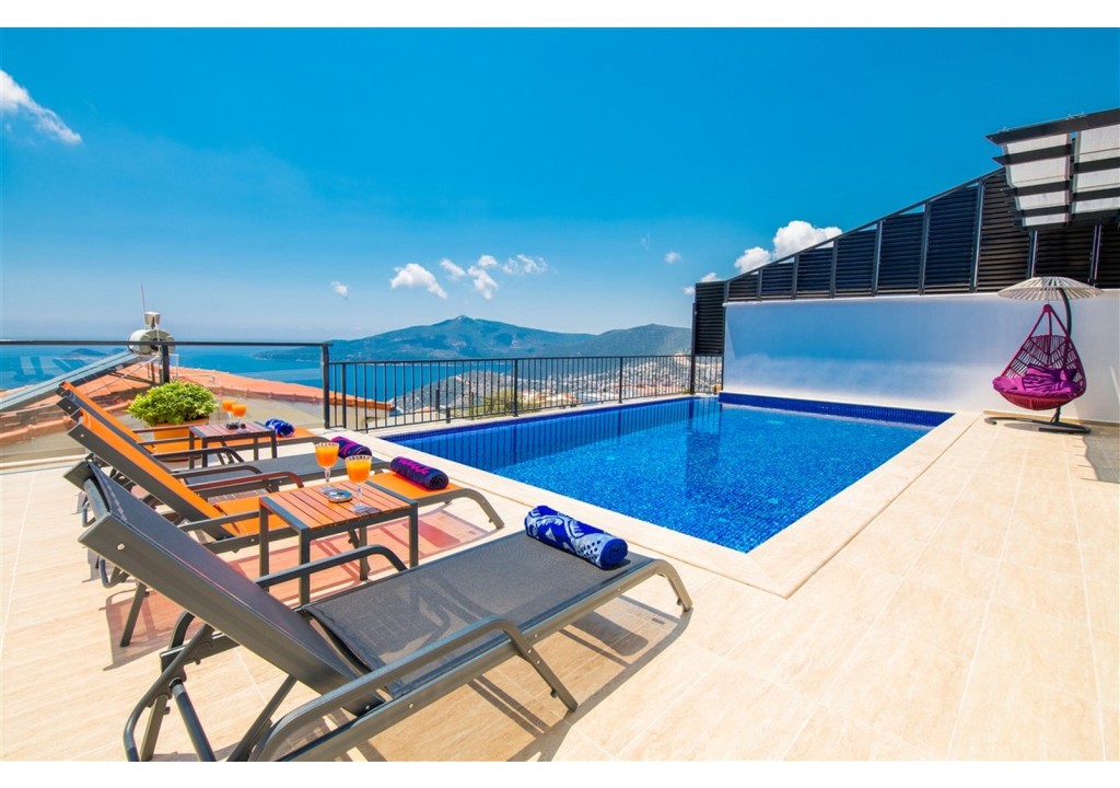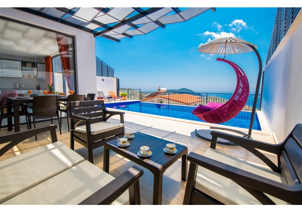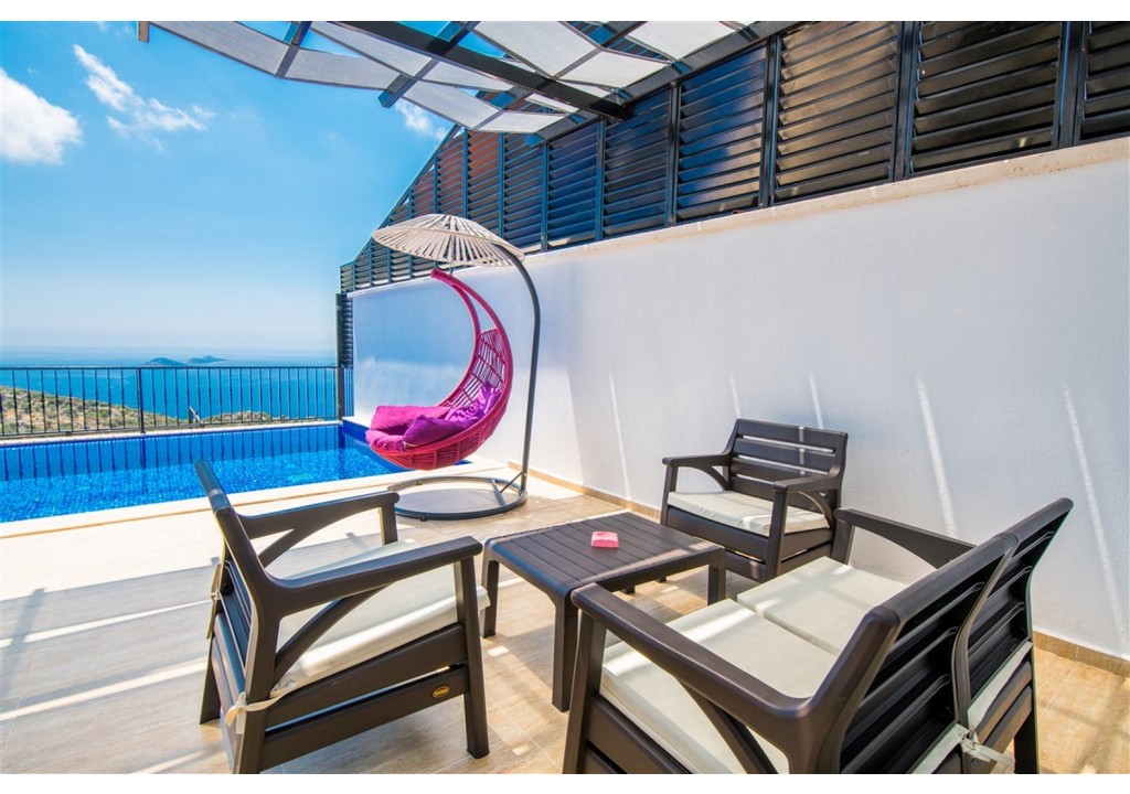 Detayları; Şezlonglar, güneş şemsiyesi, 4 kişilik yemek masası, oturma grubu.