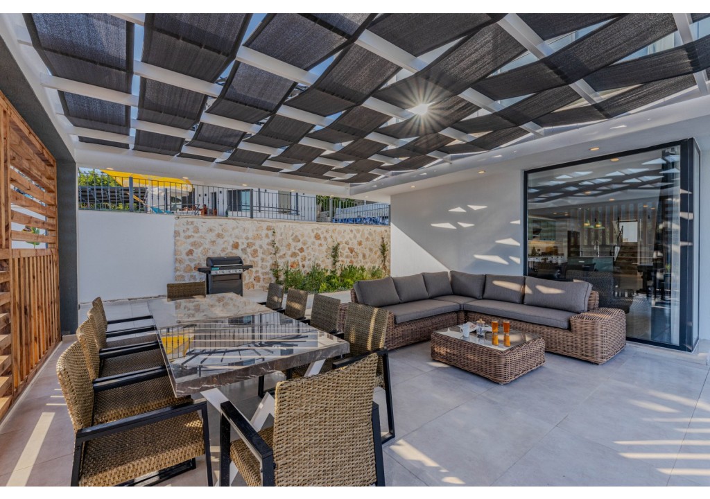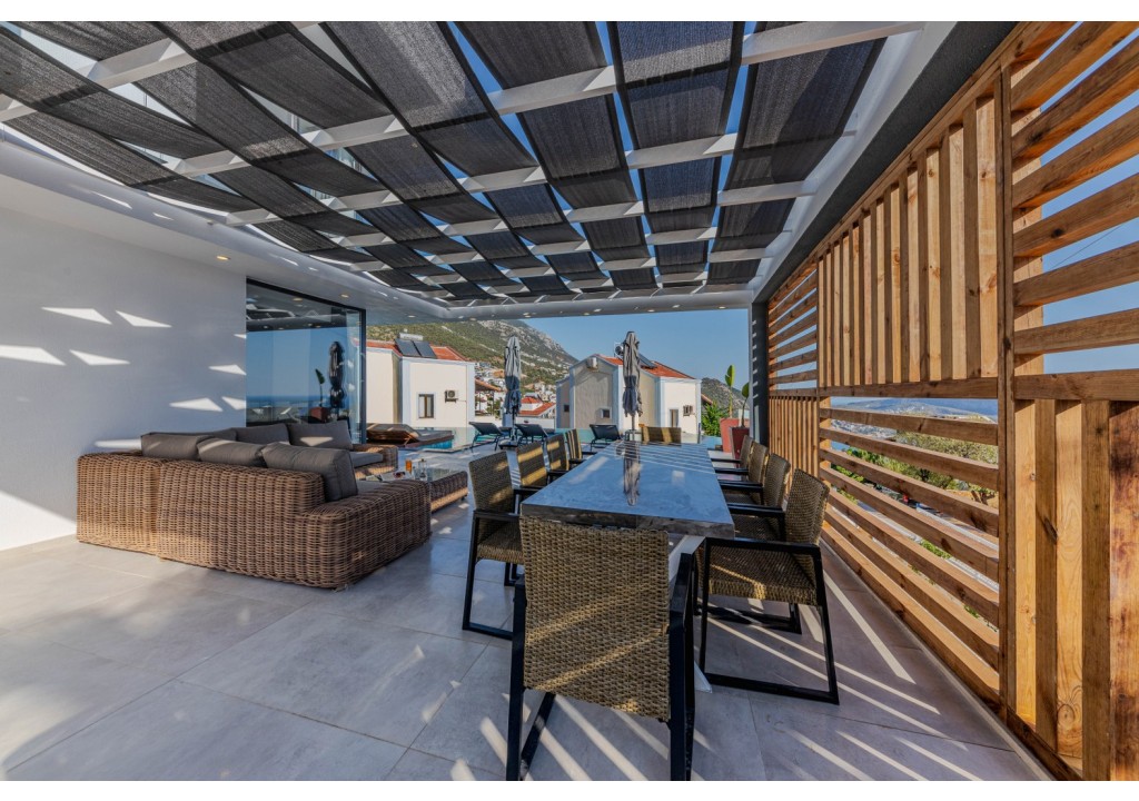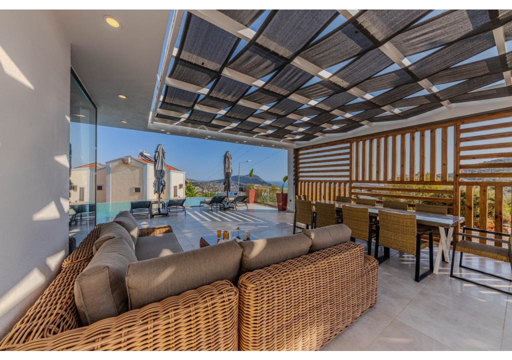 Detayları; Şezlonglar, güneş şemsiyeleri, yemek masası ve oturma grubu bulunmaktadır.