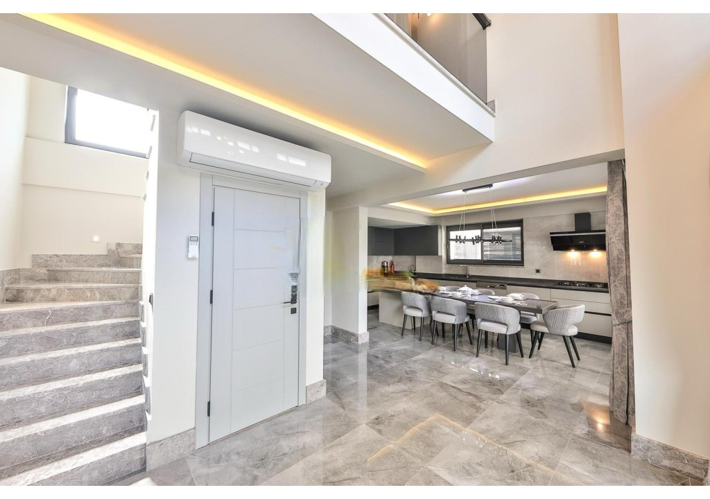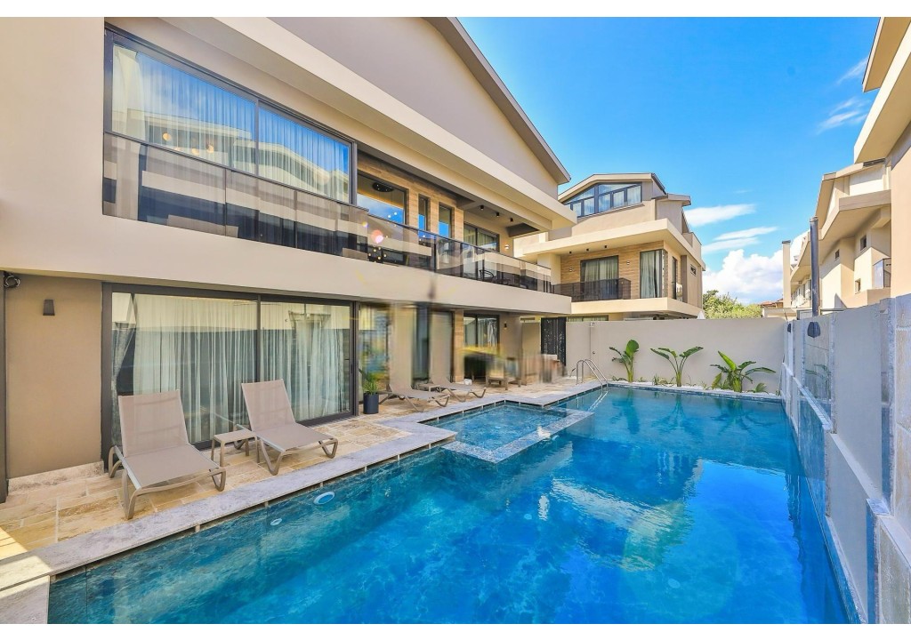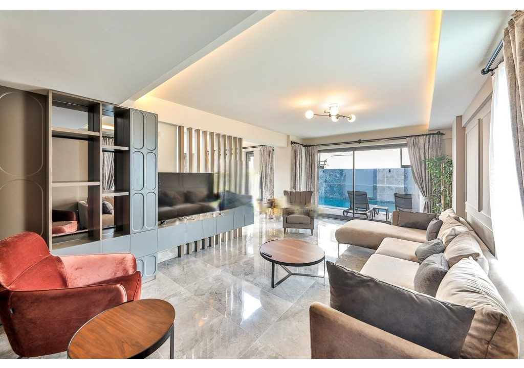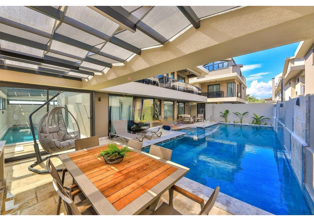 Detayları; Oturma grubu, Uydu TV (LCD), Klima,10 kişilik yemek masası, Havuz terasına çıkış,