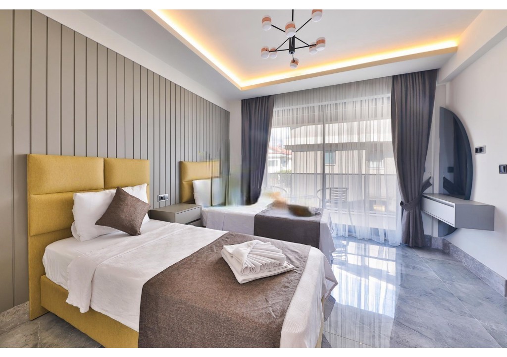 Detayları : İki adet tek kişilik yatak, Elbise dolabı, Komidin, Makyaj masası, Klima, Banyo bulunmaktadır.