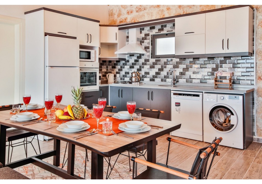 Detayları; Buzdolabı, Bulaşık makinesi, Fırın 4’lü Ocak (ankastre), Mikrodalga fırın, Elektrikli su ısıtıcı, 4 kişilik yemek takımı, Tava, Tencereler, Çatal bıçak vb.