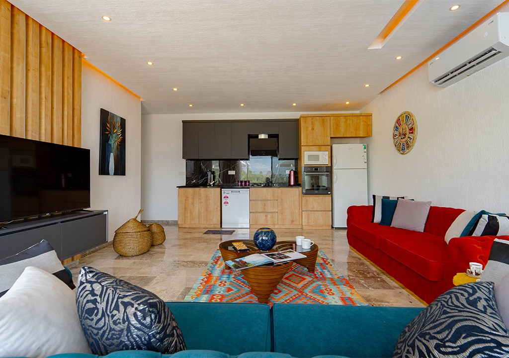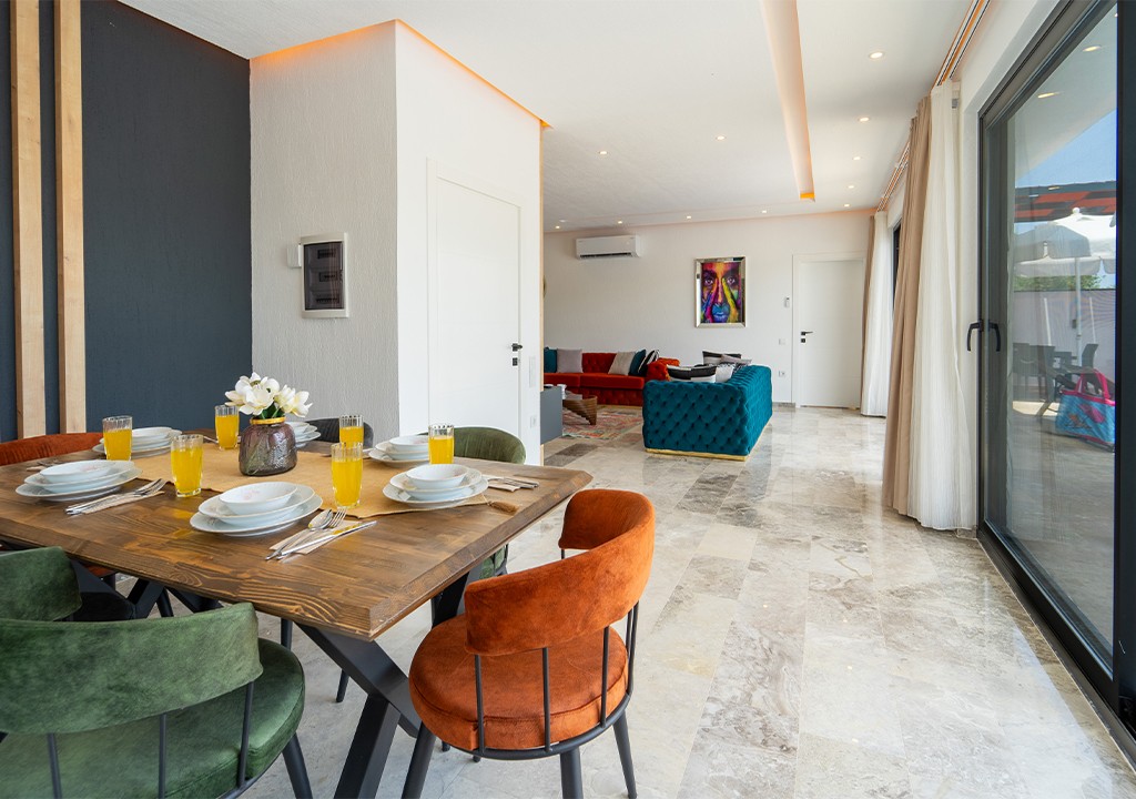 Detayları; Oturma grubu, Uydu TV (LCD), Klima, 8 kişilik yemek masası, Havuz terasına çıkış,