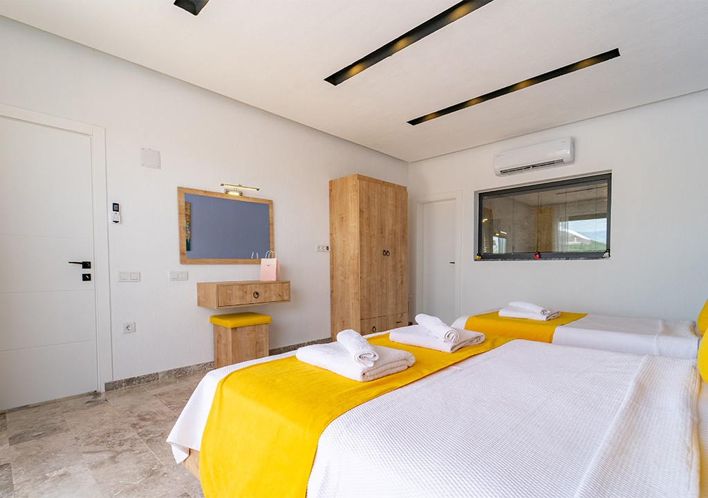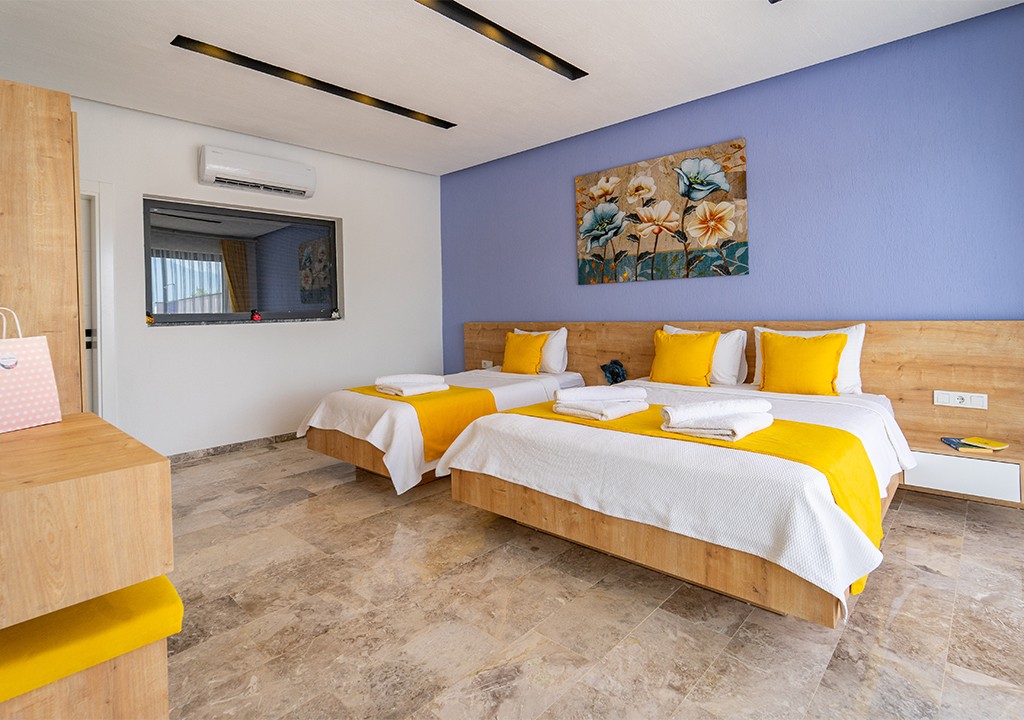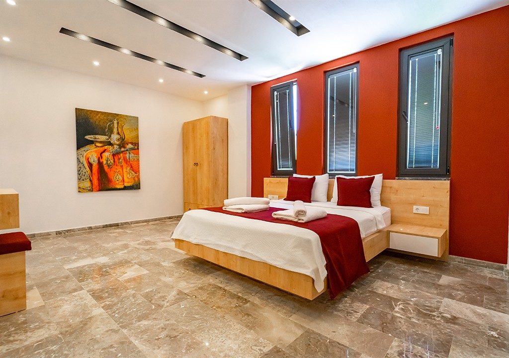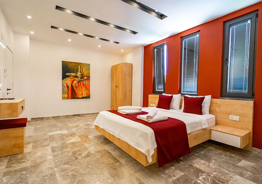 Detayları; Çift kişilik yatak, bir adet tek kişilik yatak makyaj masası, komidin, klima, elbise dolabı, banyo ve tuvalet bulunmaktadır.
