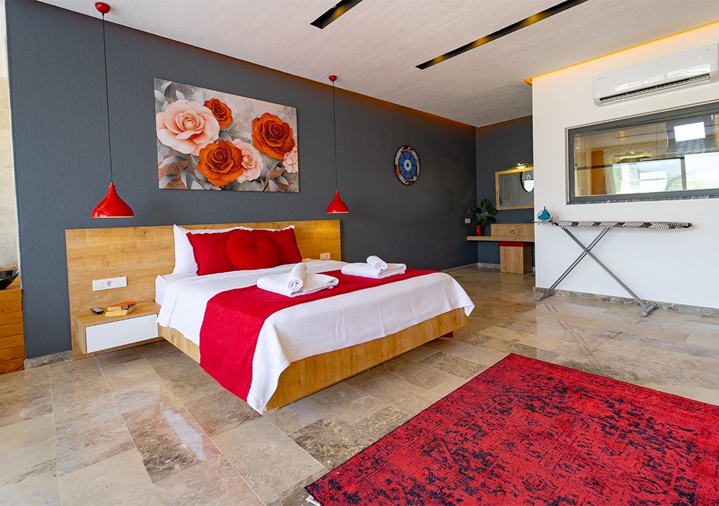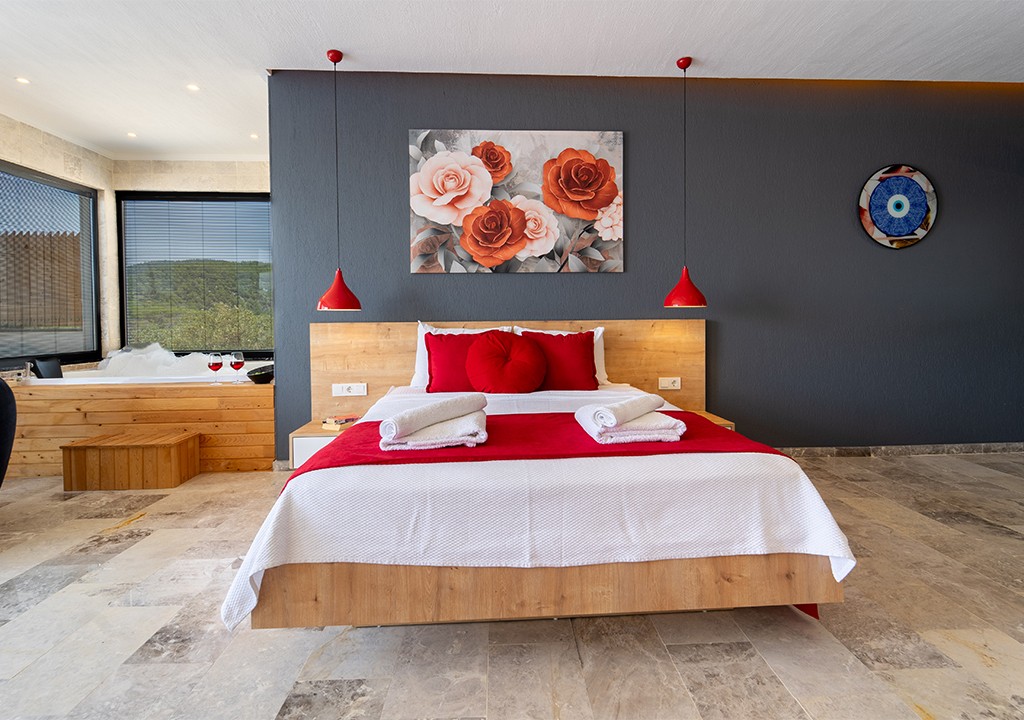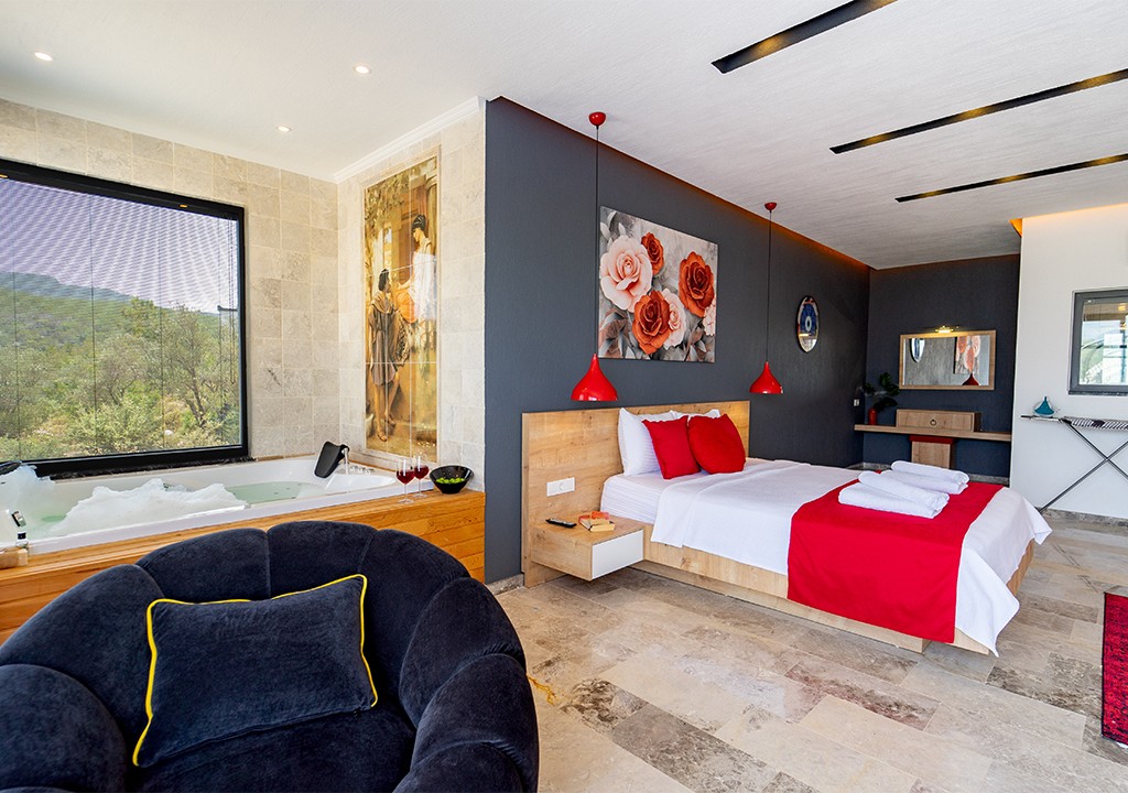 Detayları; Çift kişilik yatak, makyaj masası, komidin, klima, elbise dolabı, jakuzi, banyo ve tuvalet bulunmaktadır.