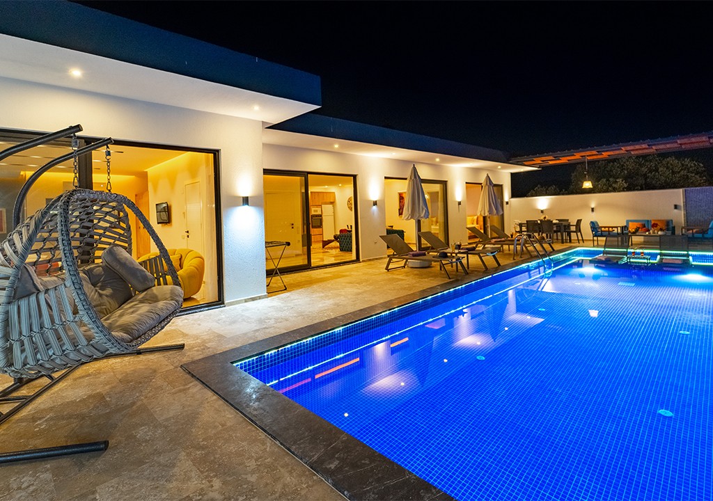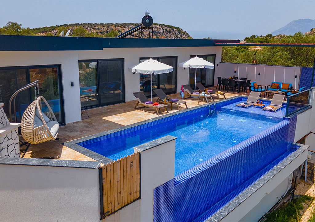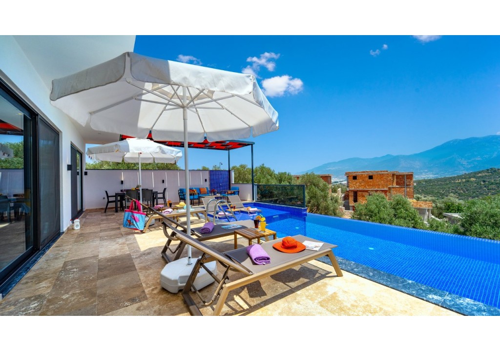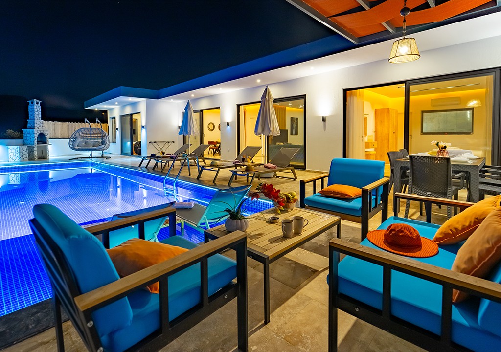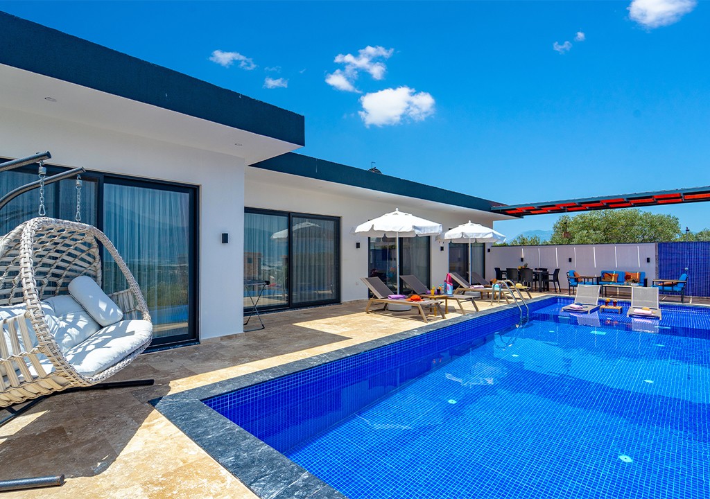 Kalkan’ın Patara mevkiinde yer alan Villa Glory 2, 3 yatak odasıyla 7 kişiye kadar konaklama kapasitesine sahiptir. Dışarıdan görünmeyen korunaklı havuz alanı, muhafazakâr aileler ve arkadaş grupları için ideal bir konaklama imkânı sunar.