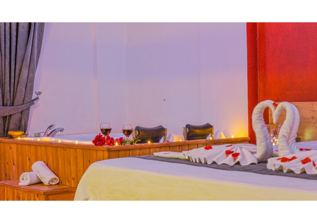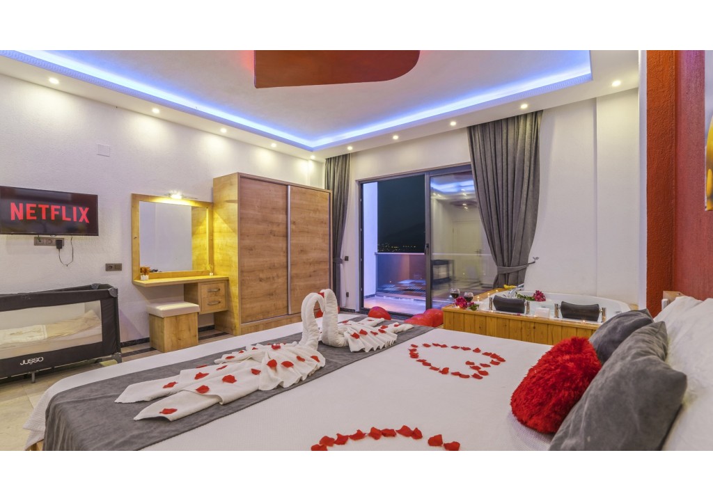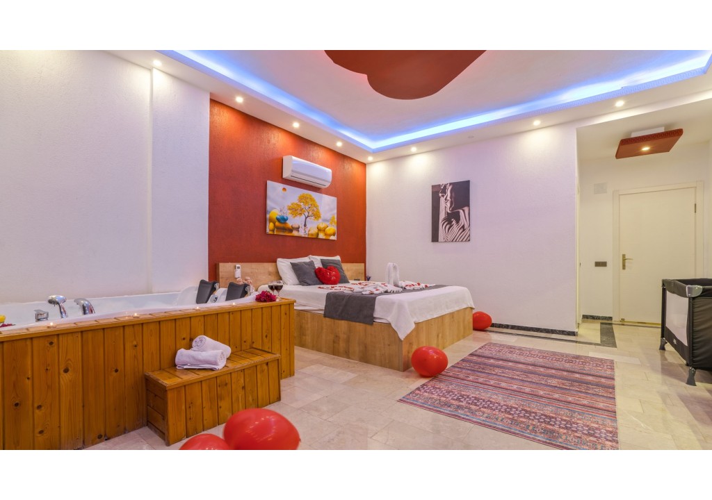 Detayları; Çift kişilik yatak, makyaj masası, komodin, klima, elbise dolabı, jakuzi , banyo ve tuvalet bulunmaktadır.