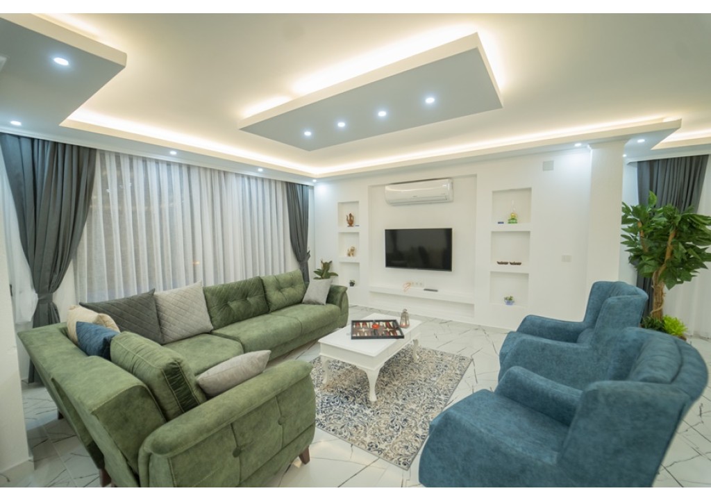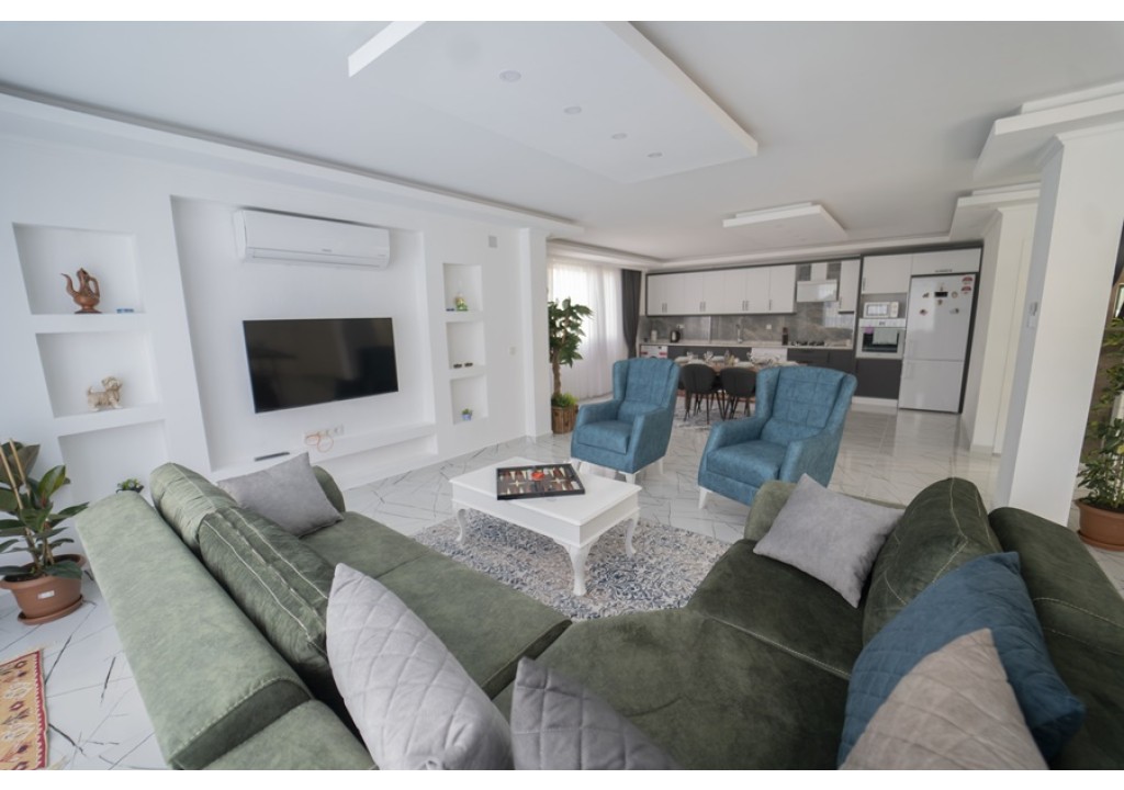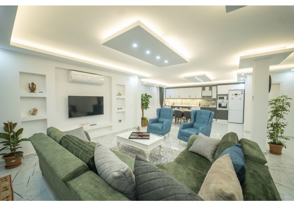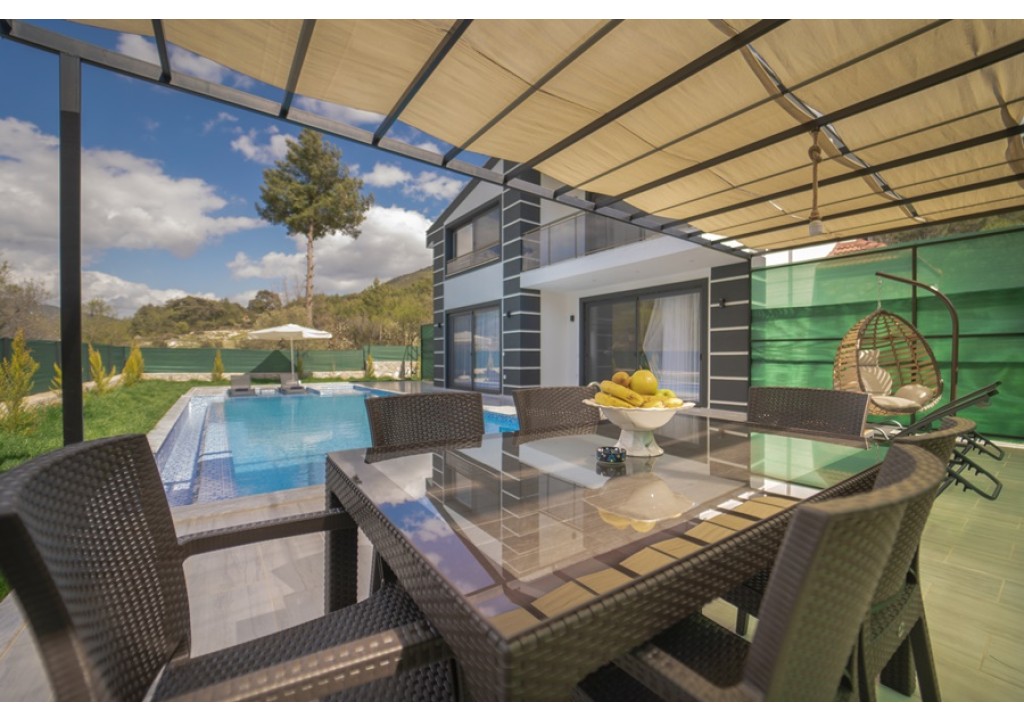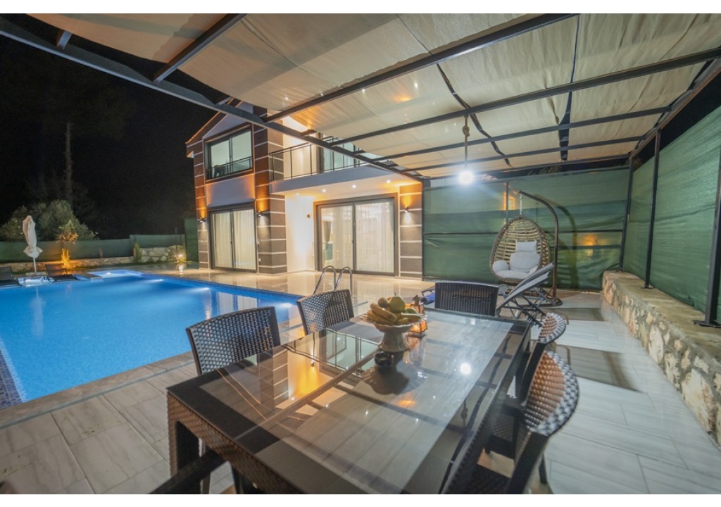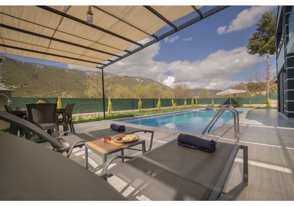 Detayları; Oturma grubu, Uydu TV (LCD), Klima, 6 kişilik yemek masası, Havuz terasına çıkış,