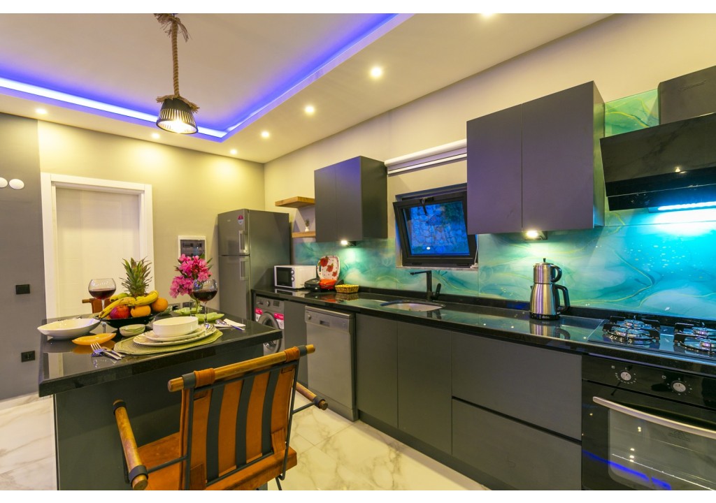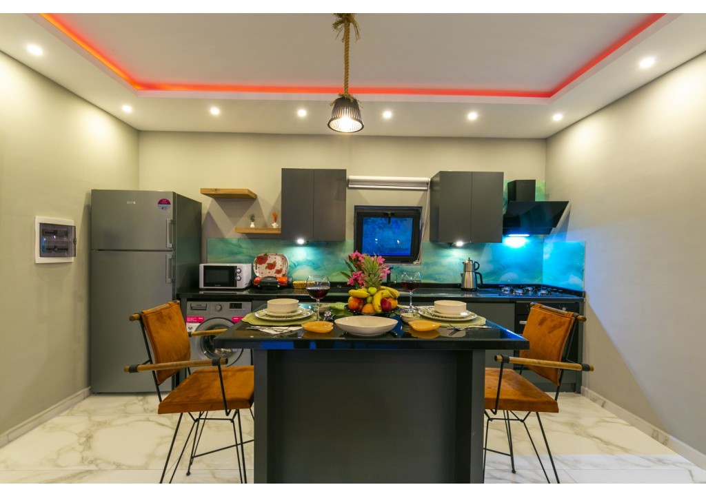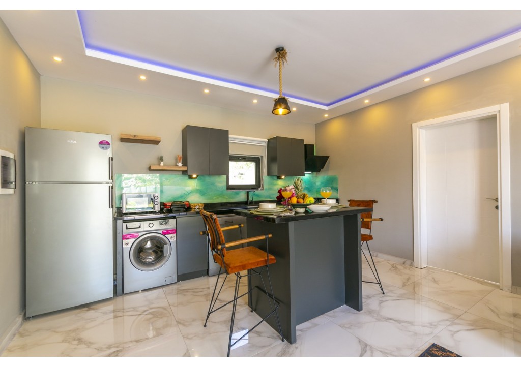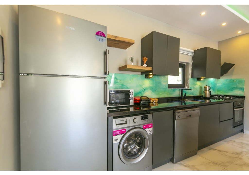 Detayları; Buzdolabı, Bulaşık makinesi, Fırın 4’lü Ocak (ankastre), Mikrodalga fırın, Elektrikli su ısıtıcı, 2 kişilik yemek takımı, Tava, Tencereler, Çatal bıçak vb.