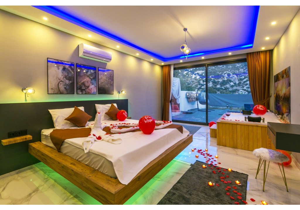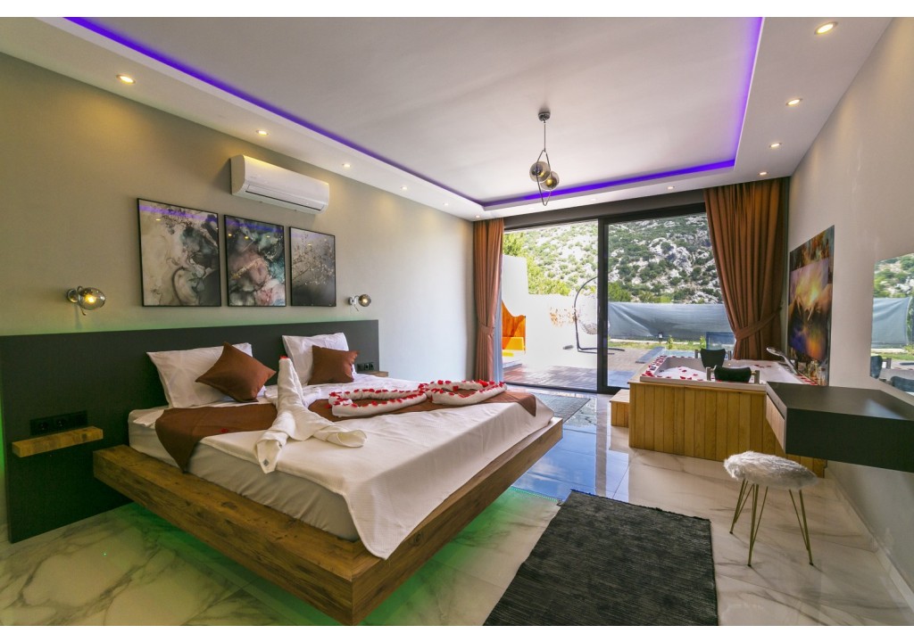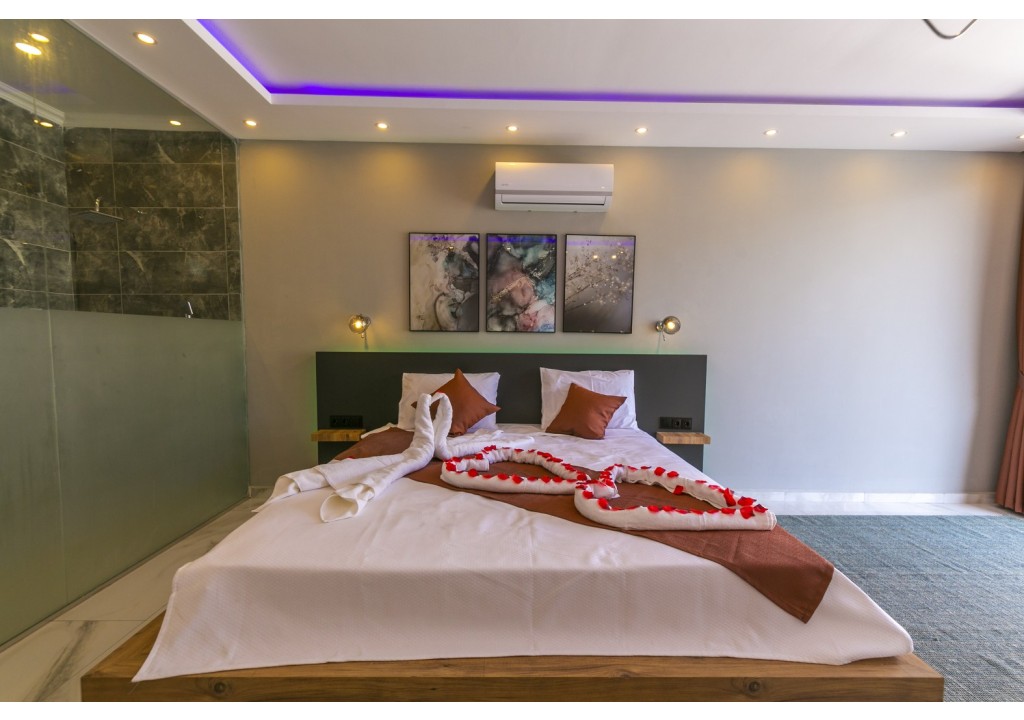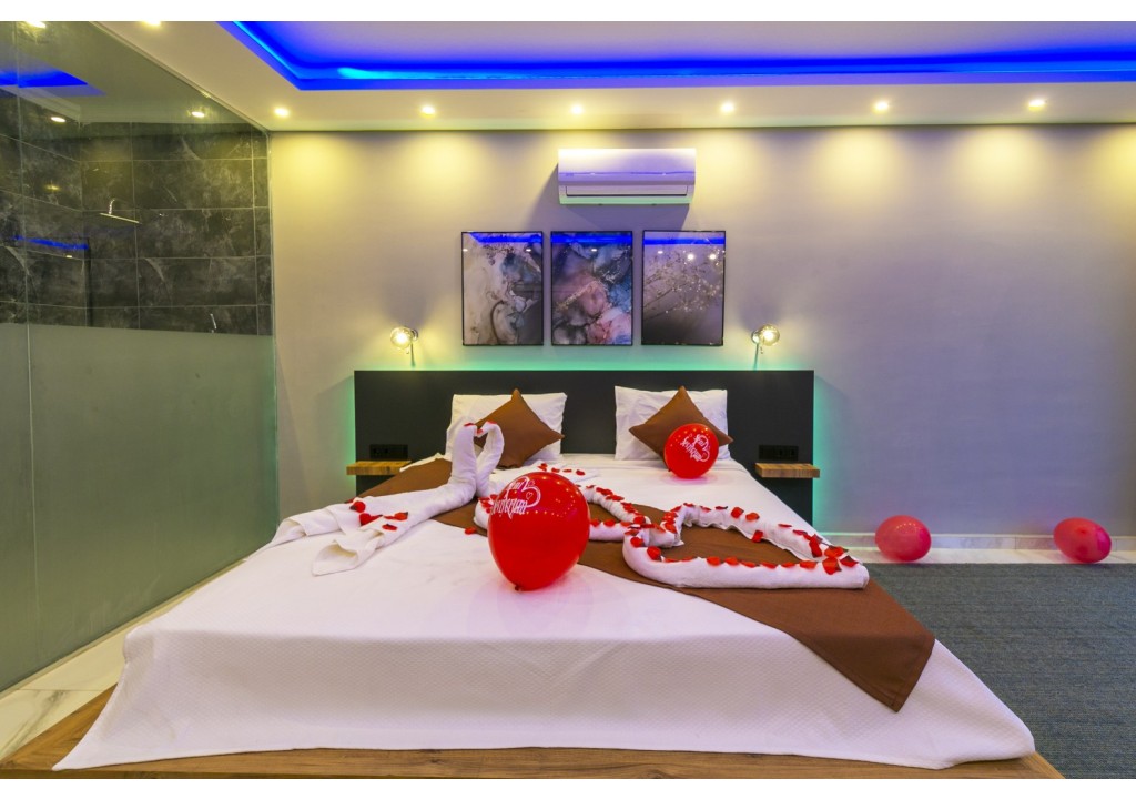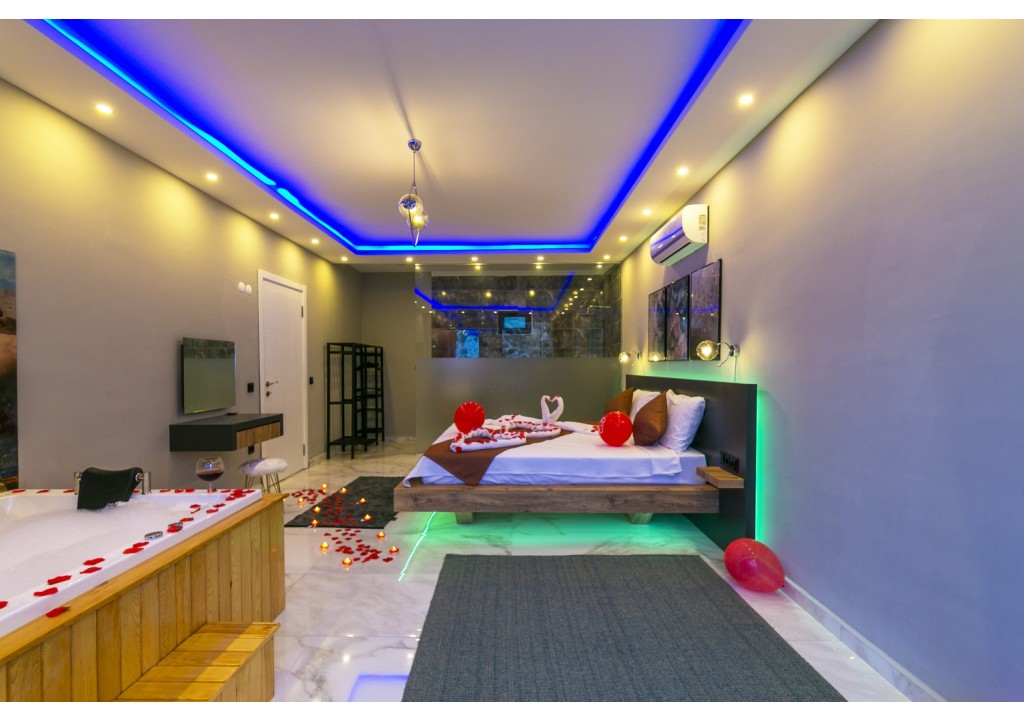 Detayları; Çift kişilik yatak, makyaj masası, komidin, klima, elbise dolabı, jakuzi, banyo ve tuvalet bulunmaktadır.