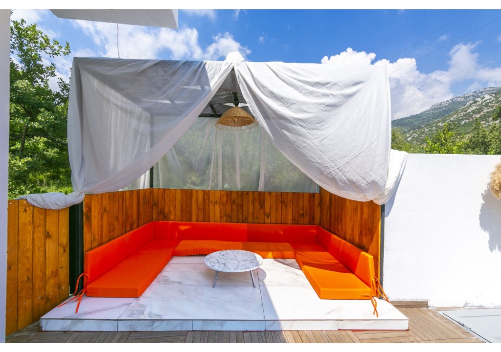 Detayları; Oturma grubu, Uydu TV (LCD), Klima, 2 kişilik yemek masası, Havuz terasına çıkış