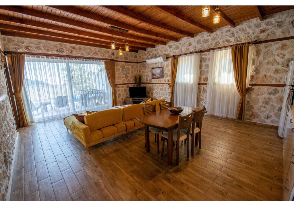 Detayları; Oturma grubu, Uydu TV (LCD), Klima, 4 kişilik yemek masası, Havuz terasına çıkış,