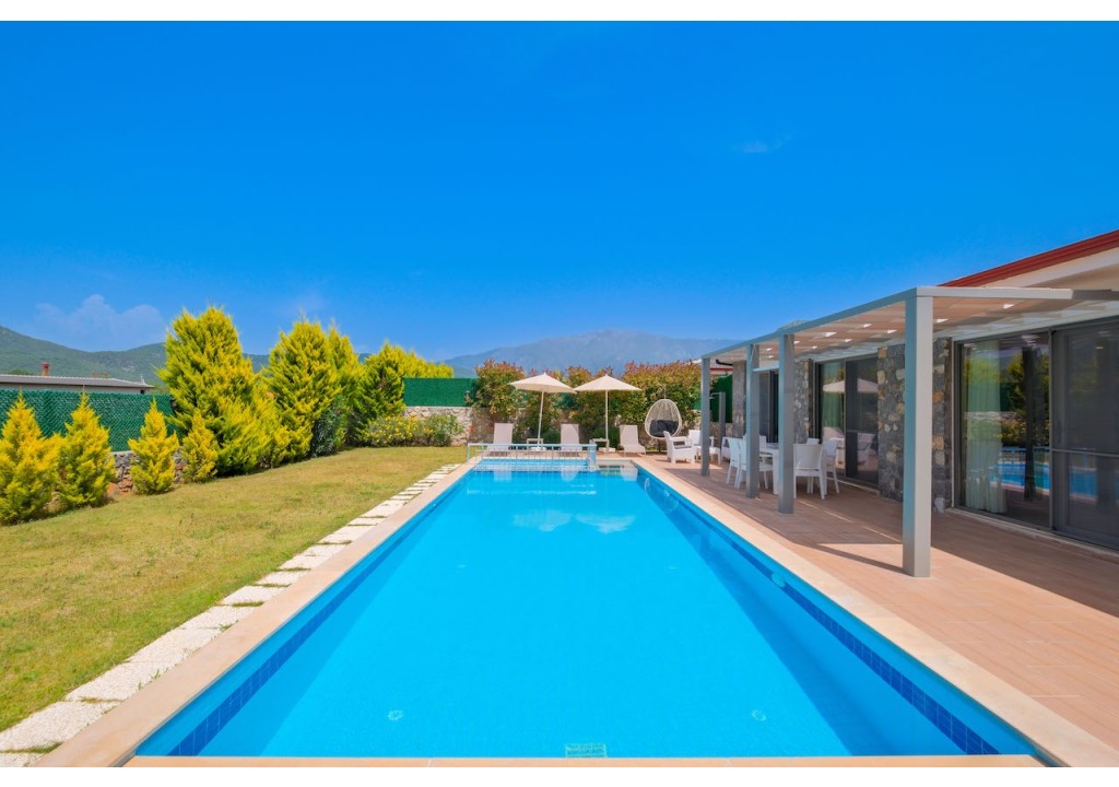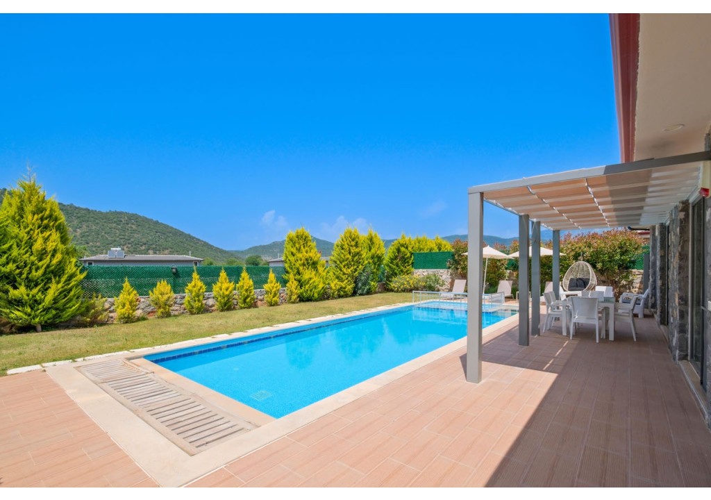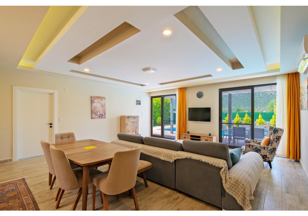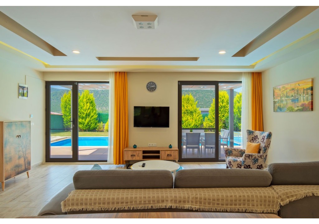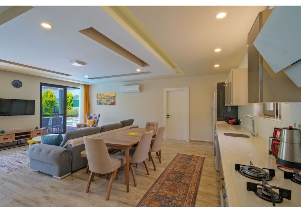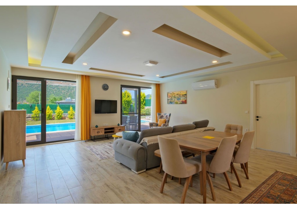 Detayları; Oturma grubu, Uydu TV (LCD), Klima, 8 kişilik yemek masası, Havuz terasına çıkış,