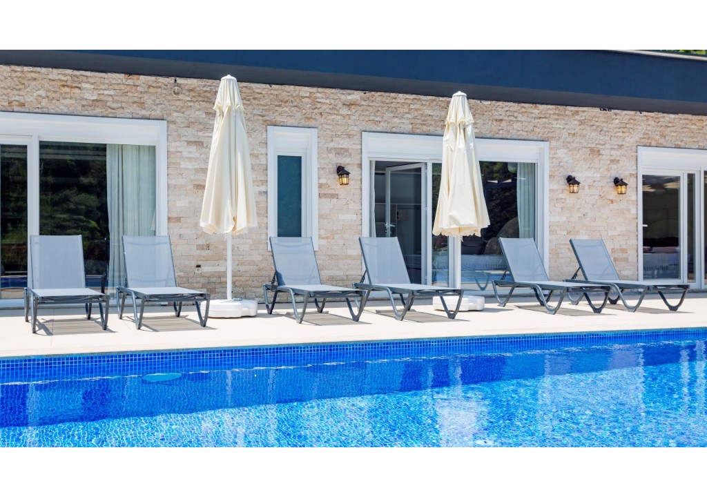 Detayları; Şezlonglar, güneş şemsiyeleri, yemek masası ve oturma grubu bulunmaktadır.