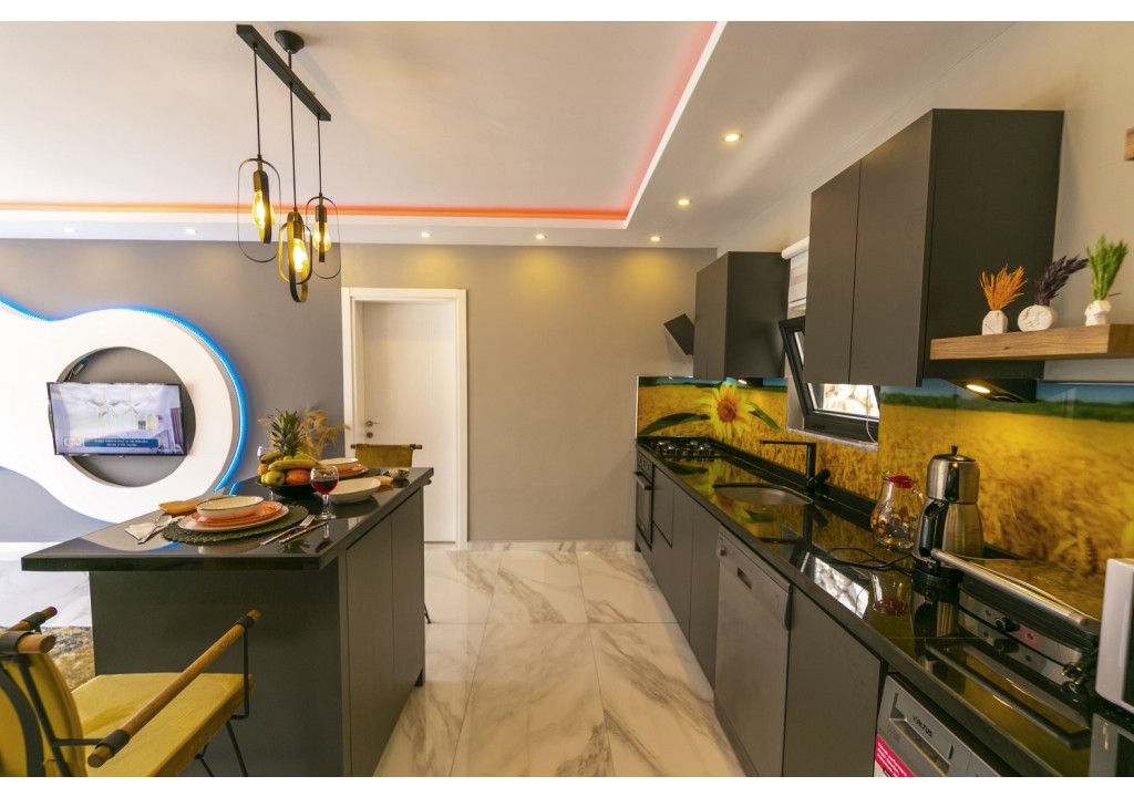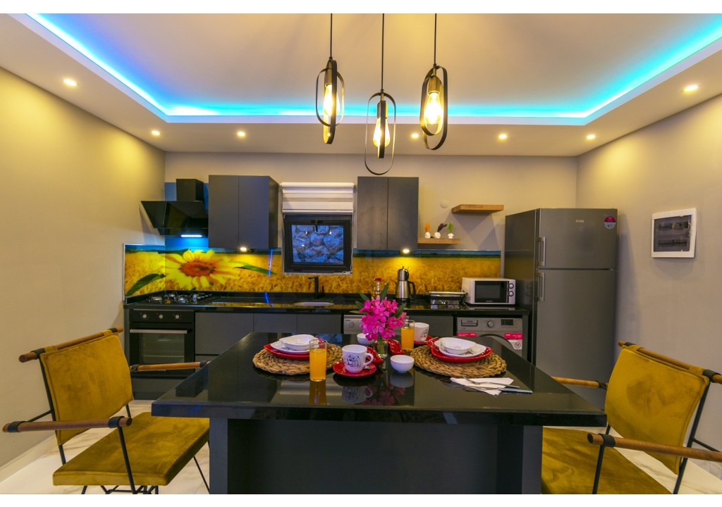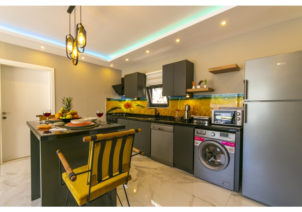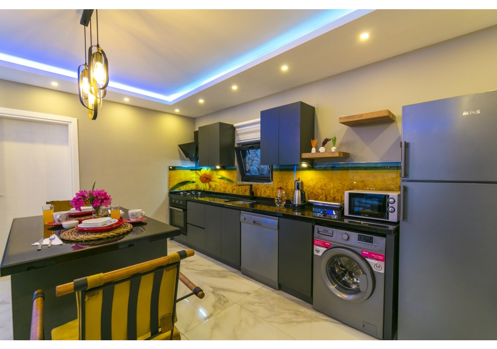 Detayları; Buzdolabı, Bulaşık makinesi, Fırın 4’lü Ocak (ankastre), Mikrodalga fırın, Elektrikli su ısıtıcı, 2 kişilik yemek takımı, Tava, Tencereler, Çatal bıçak vb.